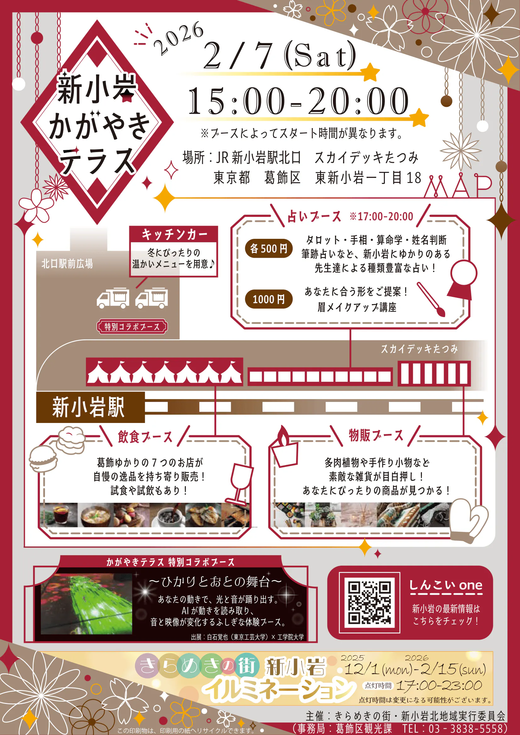 2026/02/03 18:00いつも葛飾呑んべクラフトプロジェクトを応援いただき、ありがとうございます!先日1/31の新小岩駅前音楽イベント「アート×コミュニティ 新小岩で始まる新しい日常」では、大変多くの方にご来場いただき、100本以上も「葛飾呑んべクラフト」を飲んでいただくことができました!葛飾の方に「葛飾呑んべクラフト」を知ってもらうきっかけとなったうえ、「おいしい!」という声もたくさんいただき、本当に嬉しい一日になりました。そしてなんと今回…2月7日(土)に新小岩北口にて開催されるイベント「かがやきテラス」に出店します!今回も、「葛飾呑んべクラフト」を販売予定です。前回来られた方も、来られなかった方もぜひ遊びに来てください!■ イベント概要・イベント名: かがやきテラス・日時: 2月7日(土)15:00〜20:00・場所: JR新小岩駅北口駅前 スカイデッキたつみ■ イベント内容・占いブース(17:00〜)手相・タロット・算命学など、新小岩にゆかりのある占い師による占いが各種500円にて楽しめます。・キッチンカー/飲食ブース葛飾ゆかりのお店などが出店。冬にぴったりの温かいメニューが並びます。・物販ブース多肉植物や手作り小物など、素敵な雑貨が目白押しです・特別コラボブース「〜ひかりとおとの舞台〜」あなたの動きで、光と音が踊り出す。AIが動きを読み取り、音と映像が変化するふしぎな体験ブースです。(出展:白石覚也(東京工芸大学)✕ 工学大学)「まちのビールを呑みながら、まちのイベントに参加する」そんな時間を、今回も一緒に楽しんでもらえたら嬉しいです。お近くの方はぜひふらっとお立ち寄りください。会場でお会いできるのを楽しみにしています!引き続き、葛飾呑んべクラフトプロジェクトをよろしくお願いいたします。◆1/31の新小岩駅前音楽イベント「アート×コミュニティ 新小岩で始まる新しい日常」の様子 もっと見る
