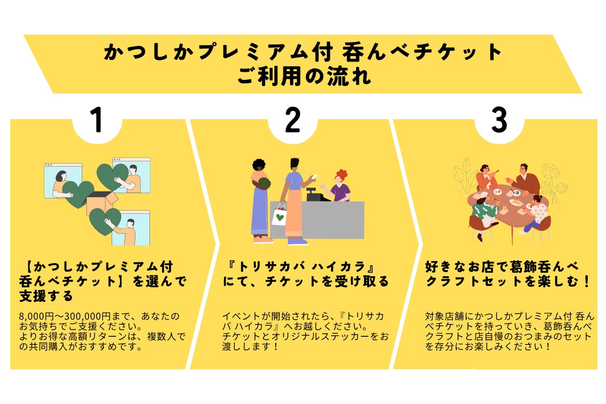 ・かつしかプレミアム付呑んべチケットは、現地でも購入可能です。ただし、1枚1,200円での販売となり、本クラウドファンディングでの購入の方が割引率が高くなります。