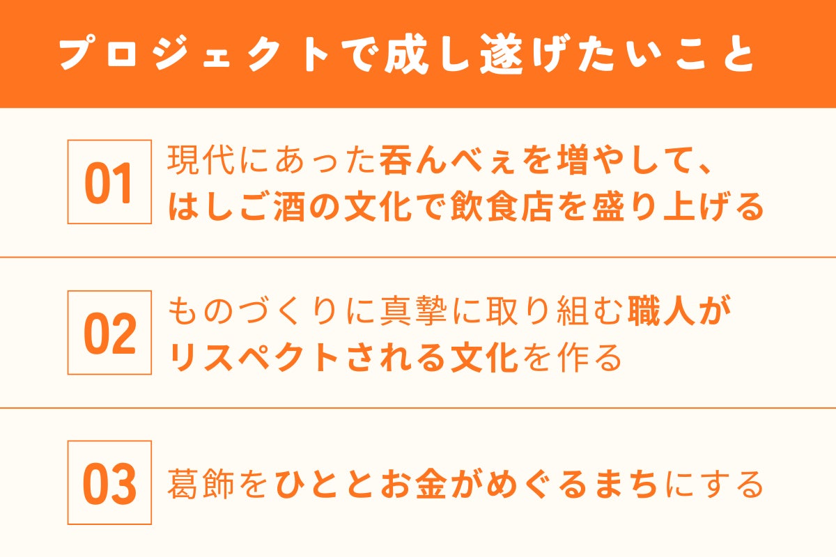 1つ目は、現代にあった呑んべぇを増やして、はしご酒の文化で飲食店を盛り上げること。呑んべぇ文化のある葛飾だからこそ、お酒を通じてこのまちをよくしたいという思いがあります。