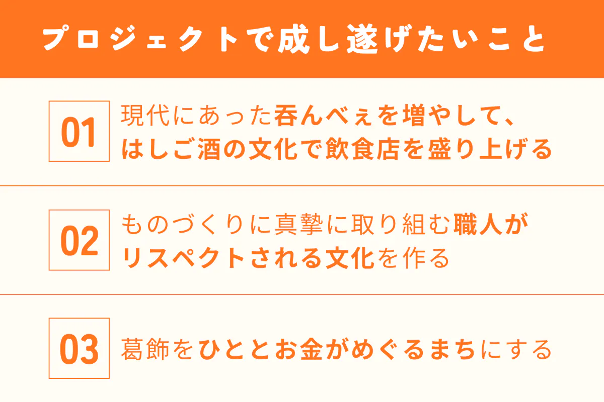 1つ目は、現代にあった呑んべぇを増やして、はしご酒の文化で飲食店を盛り上げること。呑んべぇ文化のある葛飾だからこそ、お酒を通じてこのまちをよくしたいという思いがあります。