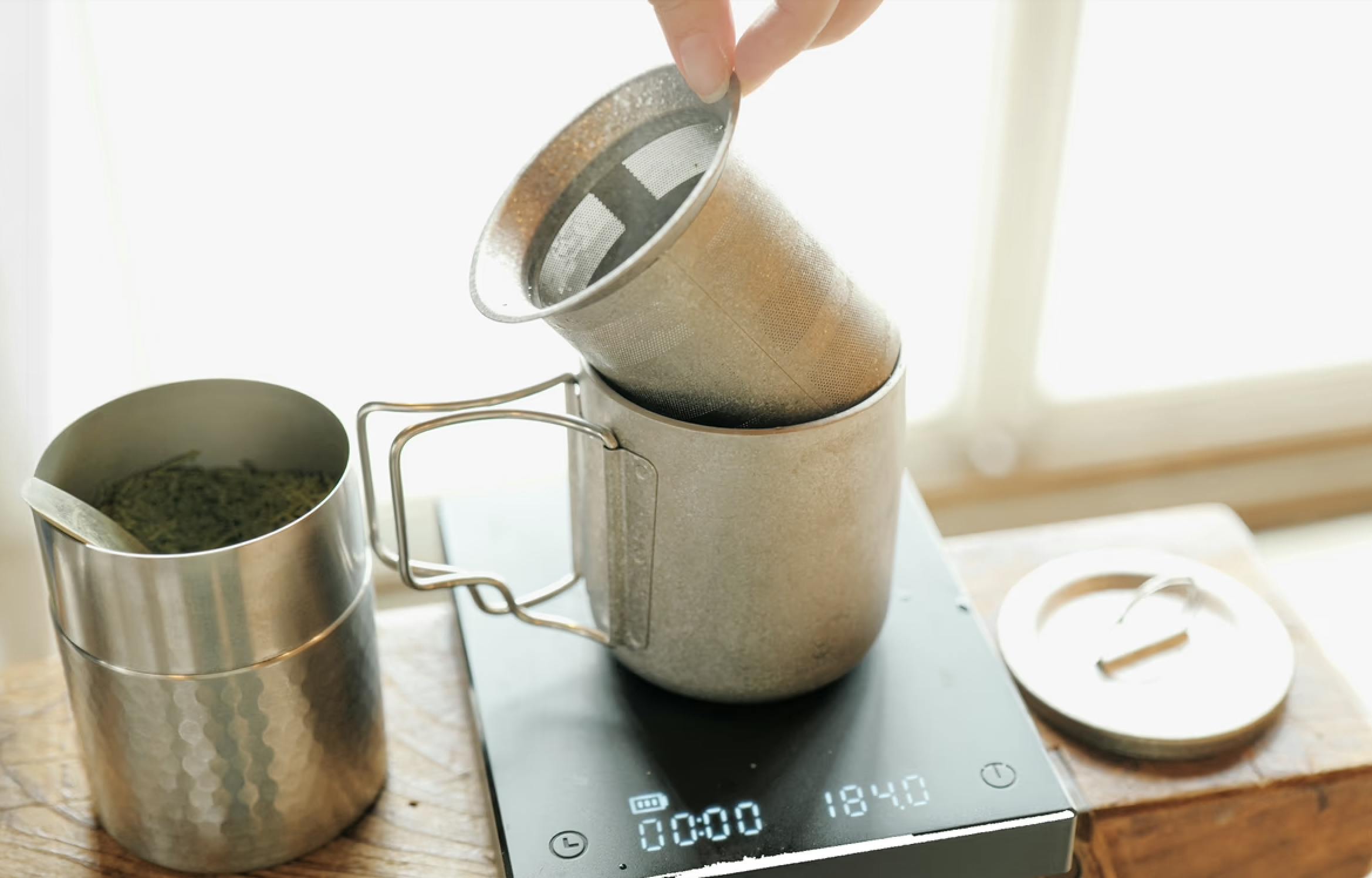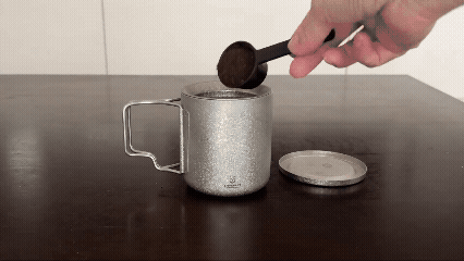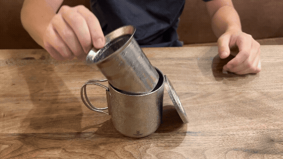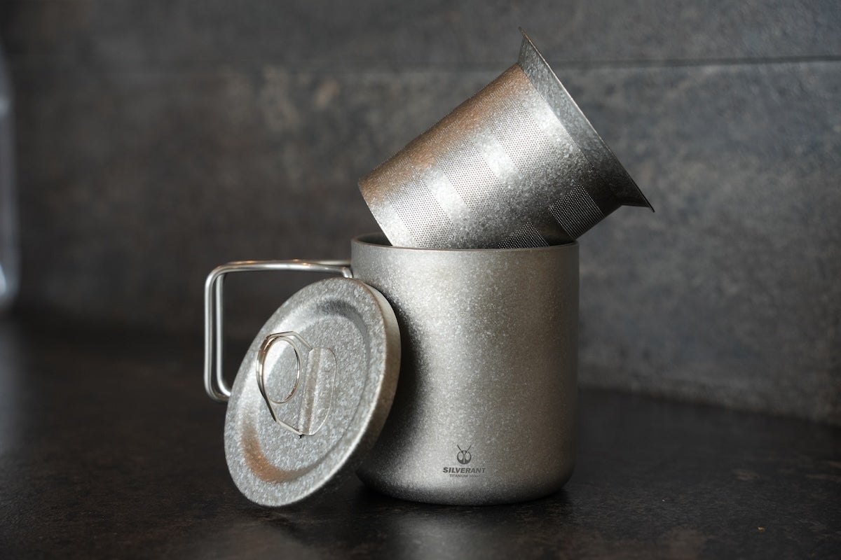 純チタンのダブルウォールマグカップと茶漉しでコーヒーを淹れてみました。