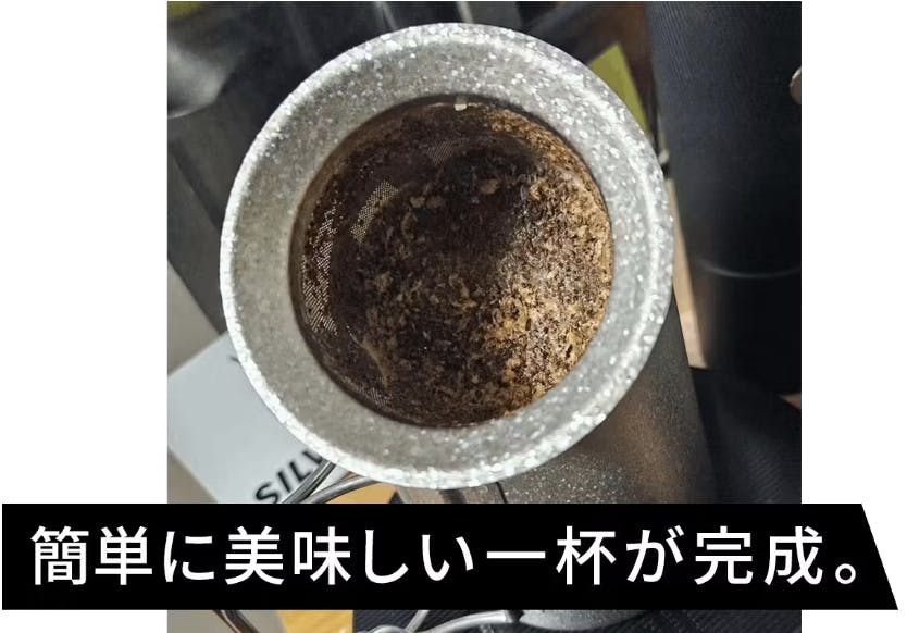 しばらくコーヒー粉を浸して、茶漉しごと上げるだけ。金属フィルターのような感覚で、簡単に美味しい一杯が完成します。