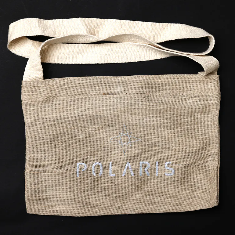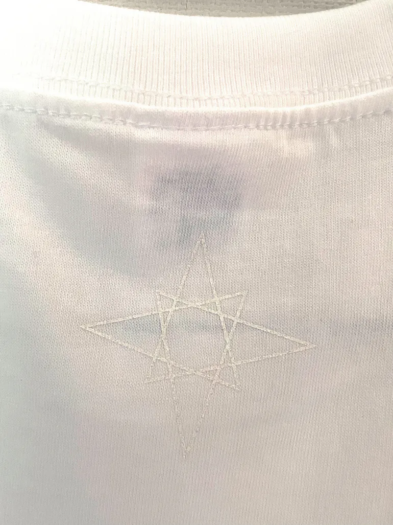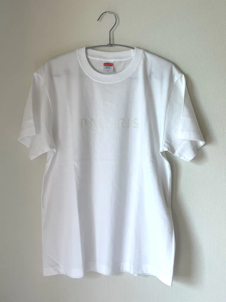 LOGO B:POLARISロゴを前面、八芒星をネック後ろに配置。ホワイト地にホワイトラメのロゴが主張しないデザインです。