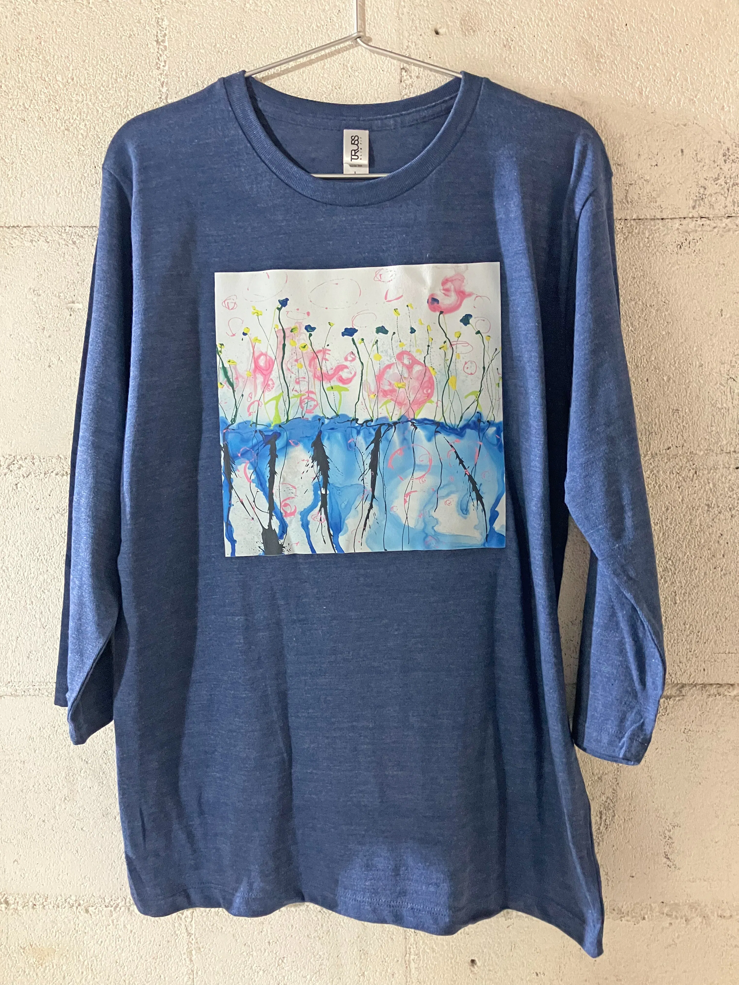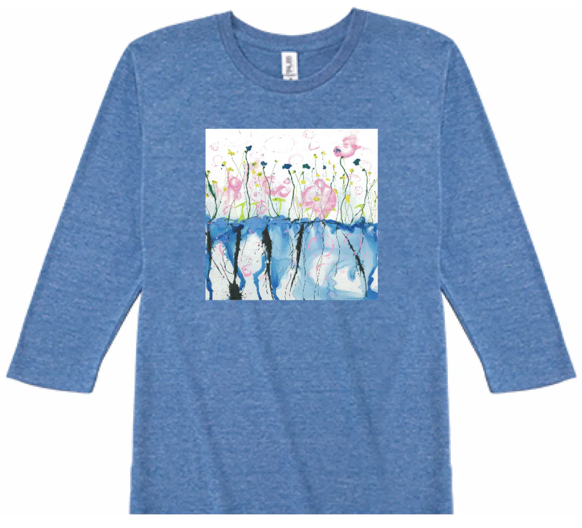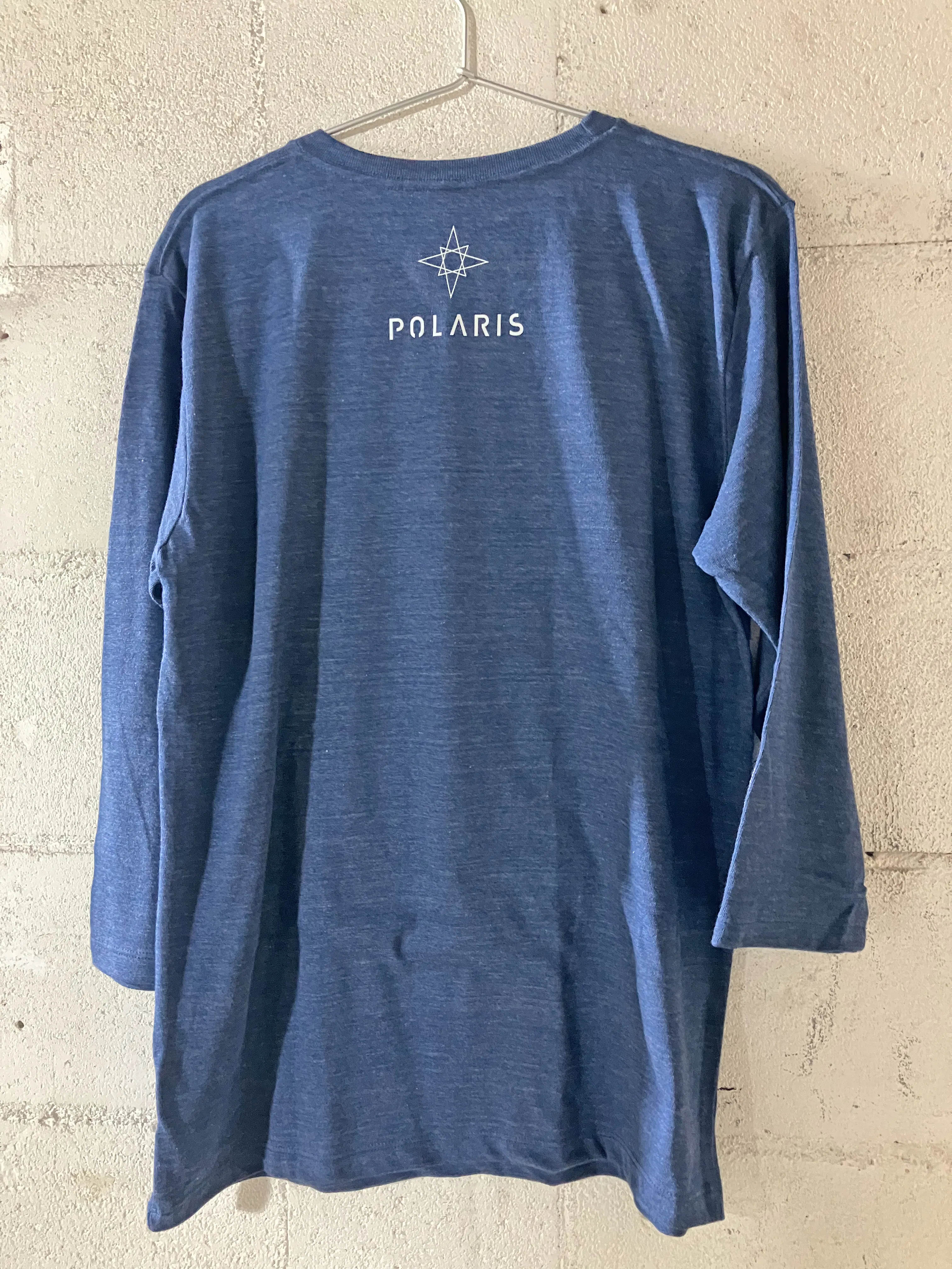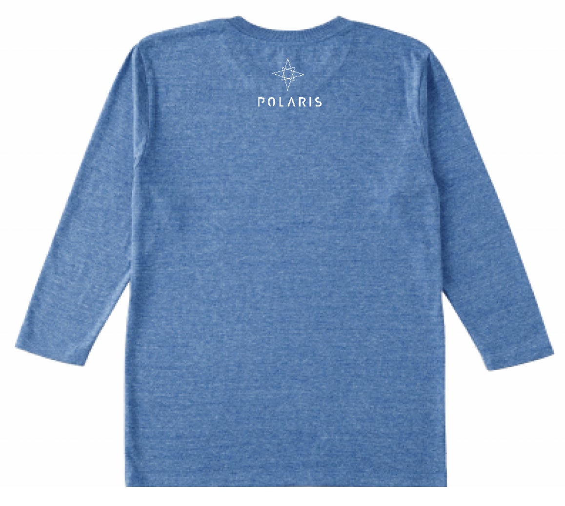 ライヴドローイングでお馴染みの画家・近藤氏の描き下ろし作品をトライブレンドのシンプルながらも一味ある三者混の薄手七分袖Tシャツに。色はヘザーディープネイビー。首裏にはPOLARISロゴが入ります。