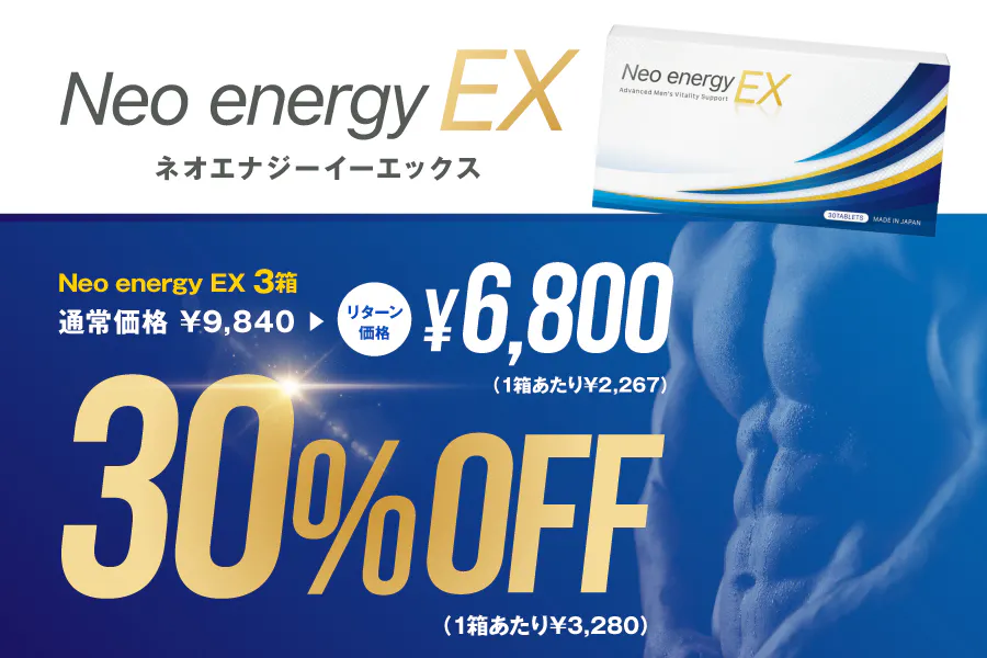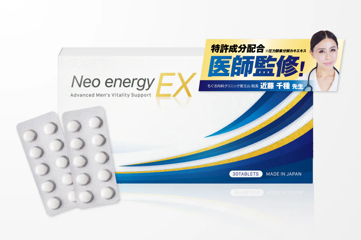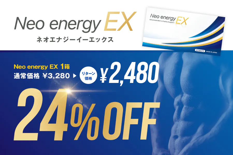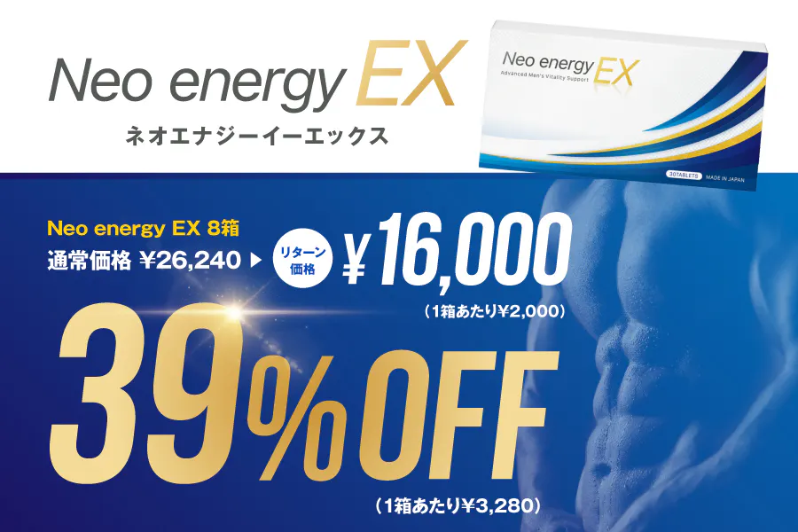 「Neo energy EX」は、”なんとなく元気が出ない”、”今の自分に物足りなさを感じる”、そんな思いを抱える男性のために開発されたサプリメントです。市販されている人気製品が14種類ほどの成分配合にとどまるなか、本製品では21種類もの有効成分を贅沢に配合しました。