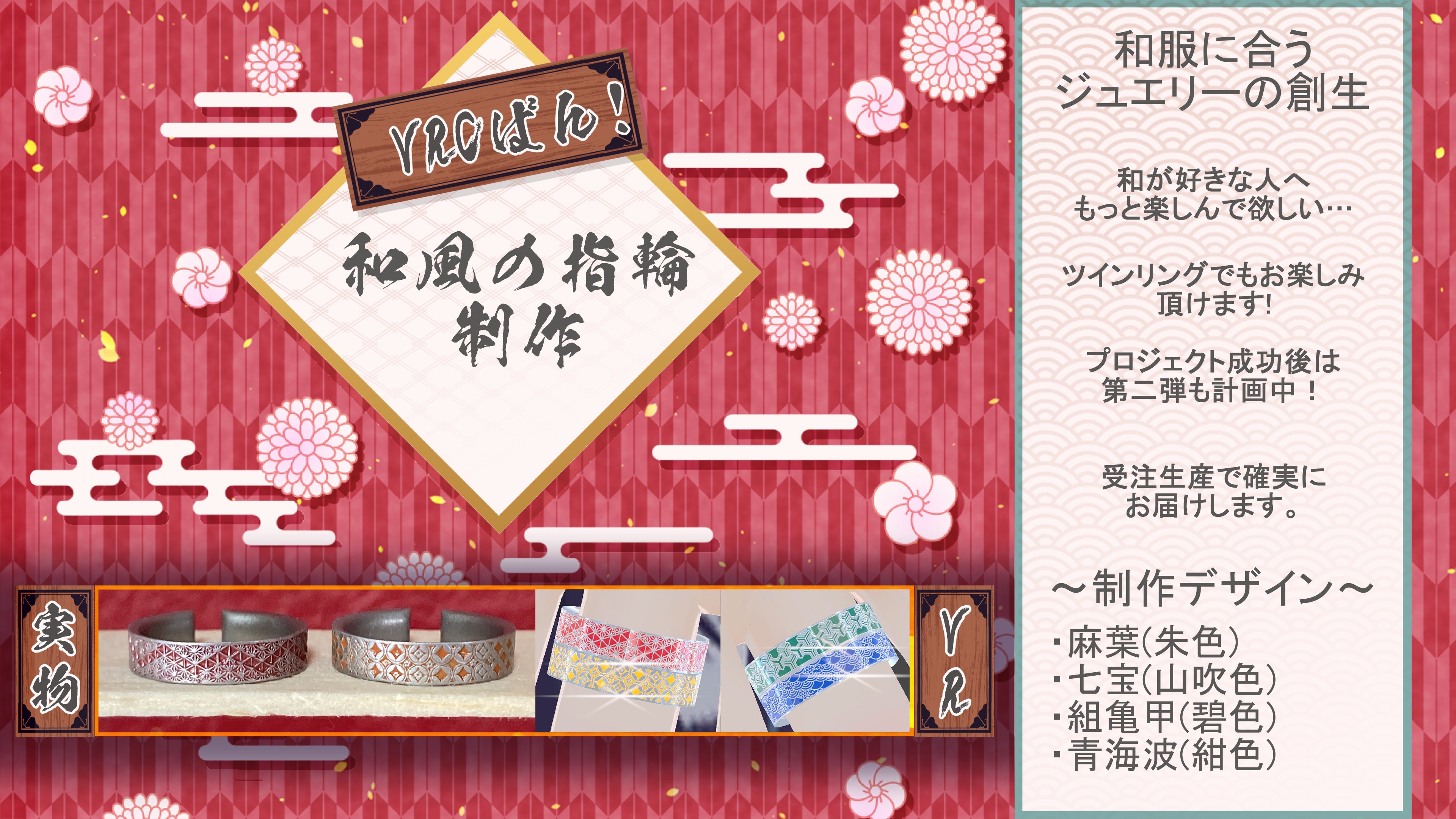 活動の更なる広報活動としてVRchatというゲームでも本プロジェクトで制作した指輪が使えるアイテムを制作しました!リアルもメタバース界も両方お楽しみ頂けるのでぜひこの機会にお求めください。*✲゚*VRC版通販ページ*✲゚* 和風指輪~4種セット~ クラファン連動企画中!https://hannaridou.booth.pm/items/7373008*✲゚*YouTubePV兼紹介動画*✲゚* VRC版和風指輪PV ~クラファン連動企画~https://youtu.be/R5foBZMt-kA*たった今リターン部分の編集を行いましたので、スタッフの方の確認・反映まで数日頂く可能性があります。
