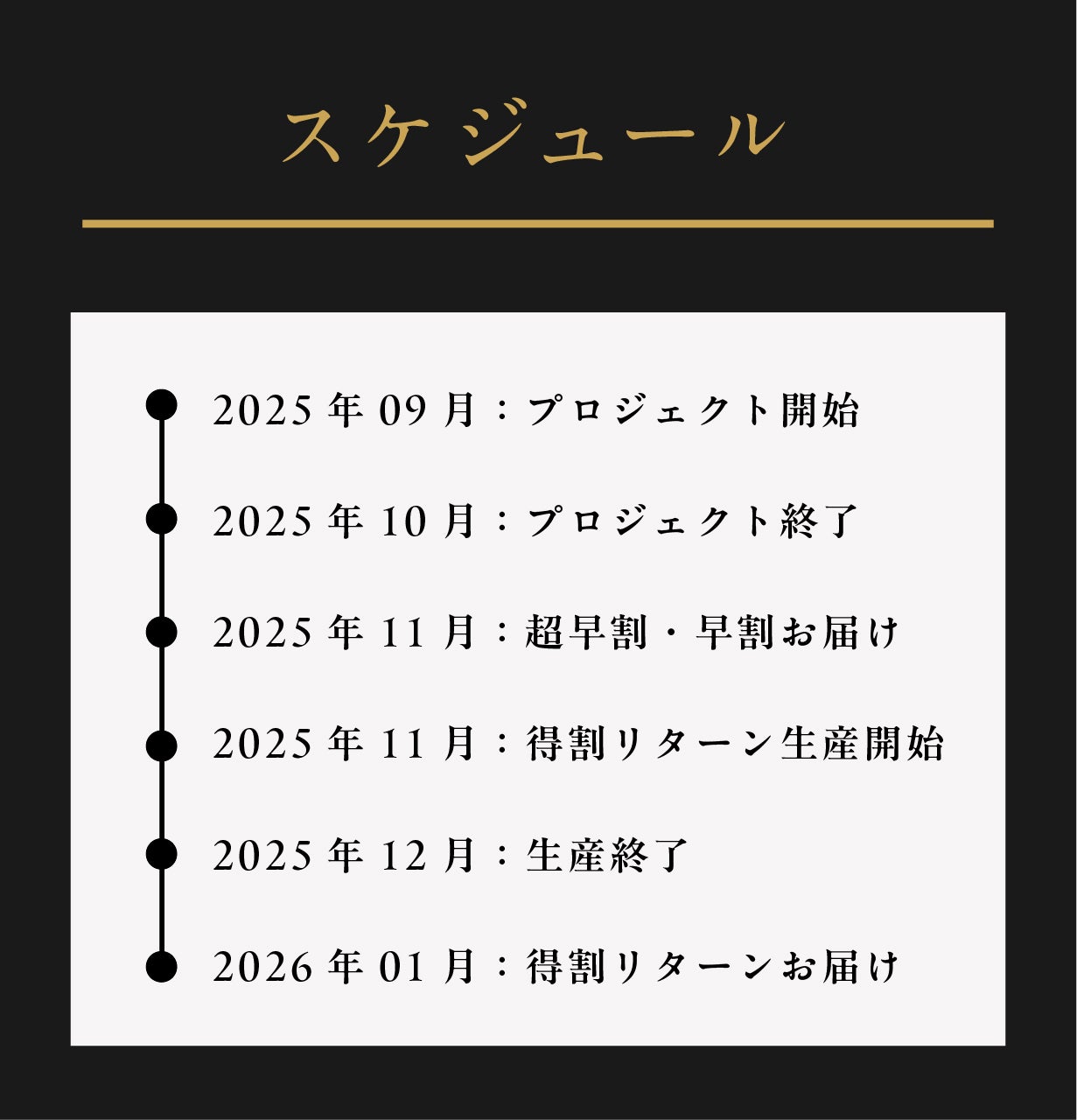 ※本文中に記載させていただいたスケジュールは、あくまでプロジェクト公開時点の予定です。プロジェクトの性質上、配送遅延のおそれがございます。原則として、配送遅延に伴うキャンセルはできませんが、リターン配送予定月から3ヶ月を超えた場合には、希望者に限りキャンセルにて対応させていただきます。