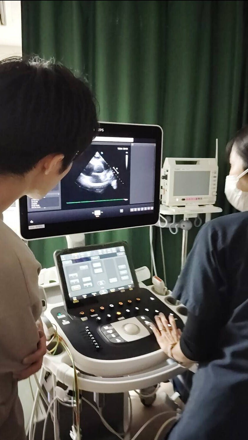 長軸・短軸のときのプローブの当て方から、心臓四腔断面(4-chamber view)の見方、さらにその時に何が見えているのかまで詳しく伝授していただきました!