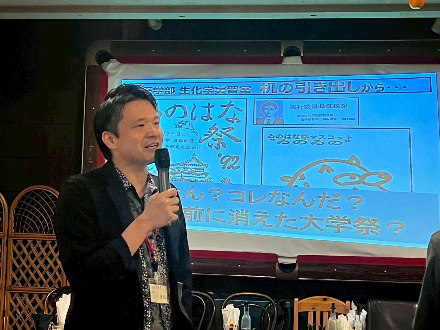亥鼻祭復活の立役者・吉村先生からは、もはや伝説級のエピソードを披露していただきました。なんと亥鼻祭復活のきっかけは、生化学の実習室で机の引き出しから偶然発見した1992年のパンフレット!10年前に消えた大学祭を見て「これ、復活させない?」と飲み会での軽いノリからだったらしいです。