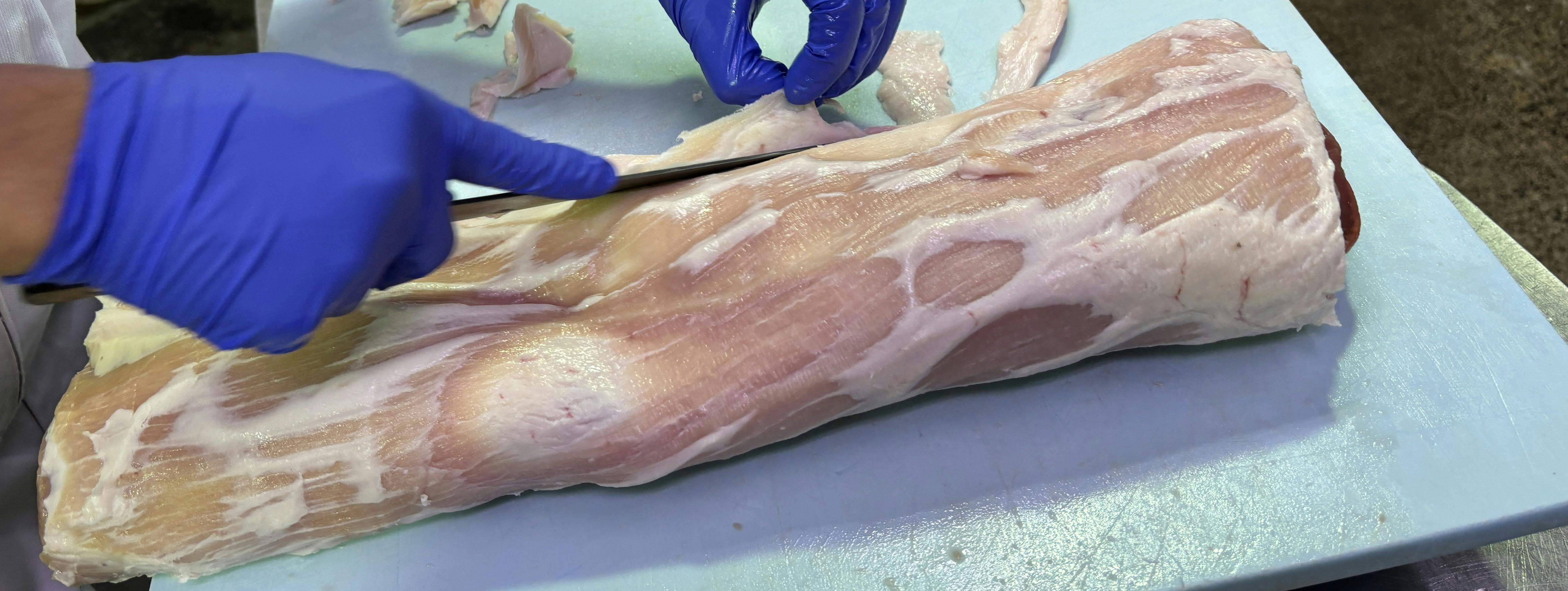 内側になるほうのチャーシューの脂を丁寧に除きます。