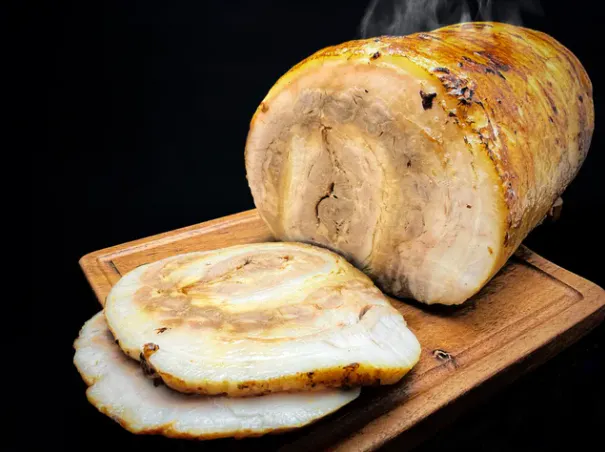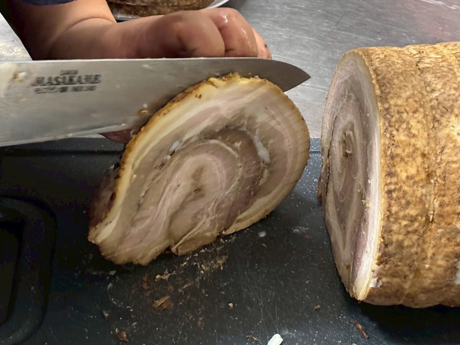 ラーメン屋などでくるくると巻いてあるチャーシューを見たことがあると思います。大きくなればなるほど、綺麗な渦巻きにするのは難しくなっていきどうしても歪んだ渦になりがちです。それを熟練の職人が一つ一つ手作業で紐巻きをし、紐を巻いた肉塊を一晩冷蔵庫で寝かすことによって肉塊に形状を記憶させます。その一手間が「ねんりん」のような綺麗な形に近づけてくれるのです。