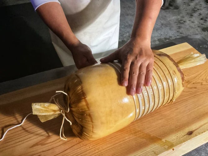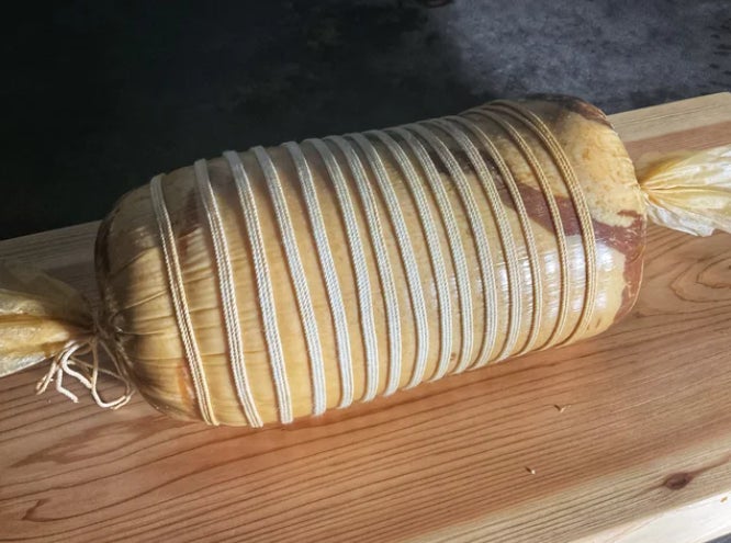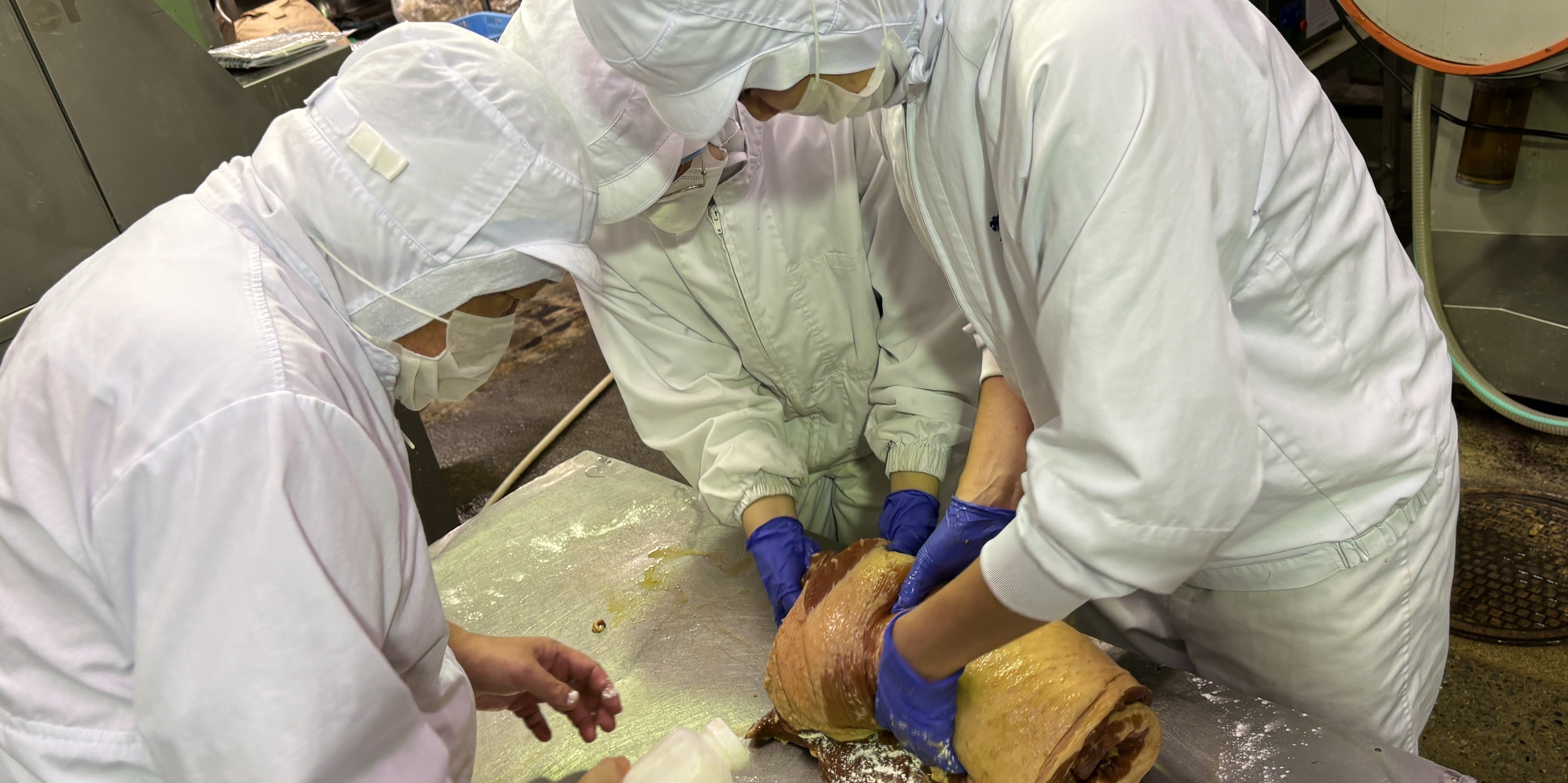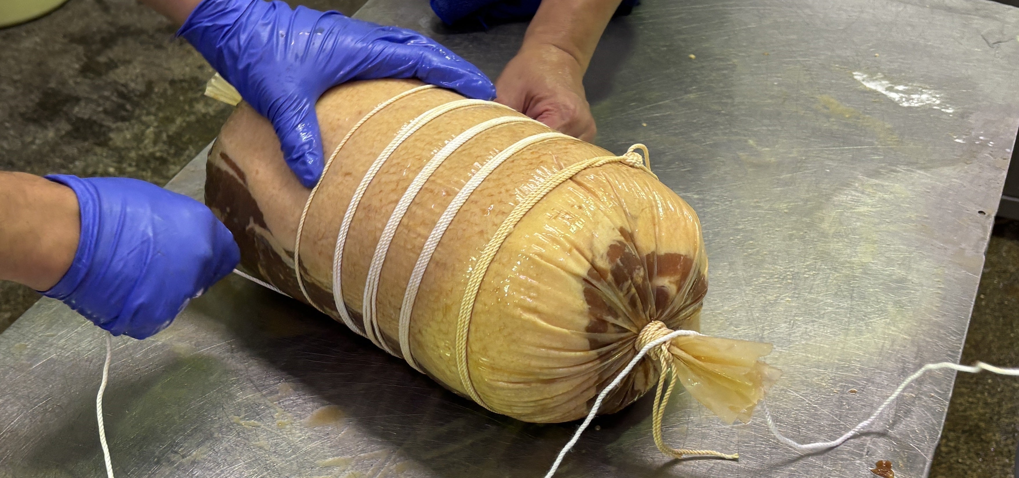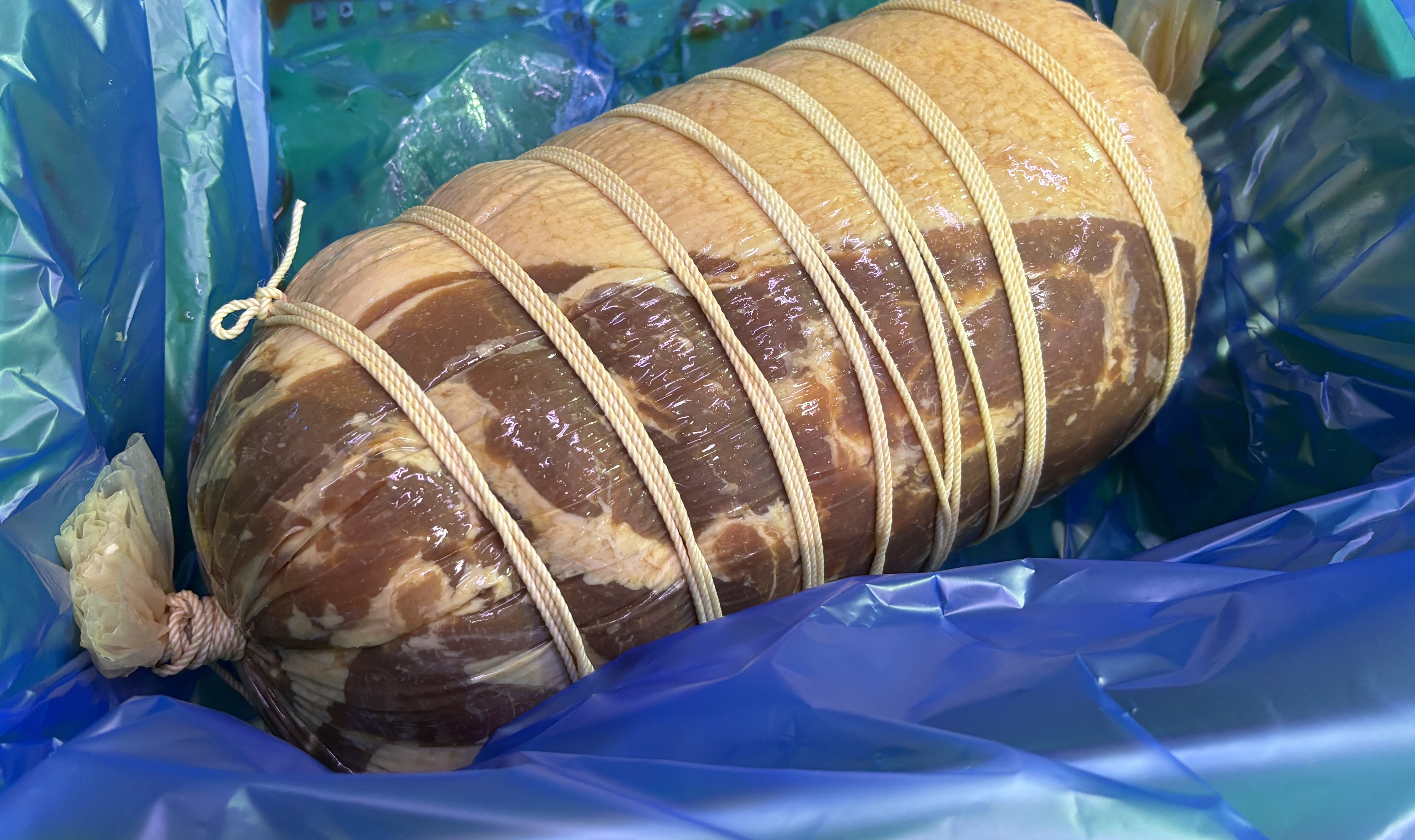 ラーメン屋などでくるくると巻いてあるチャーシューを見たことがあると思います。大きくなればなるほど、綺麗な渦巻きにするのは難しくなっていきどうしても歪んだ渦になりがちです。それを熟練の職人が一つ一つ手作業で紐巻きをし、紐を巻いた肉塊を一晩冷蔵庫で寝かすことによって肉塊に形状を記憶させます。その一手間が「ねんりん」のような綺麗な形に近づけてくれるのです。
