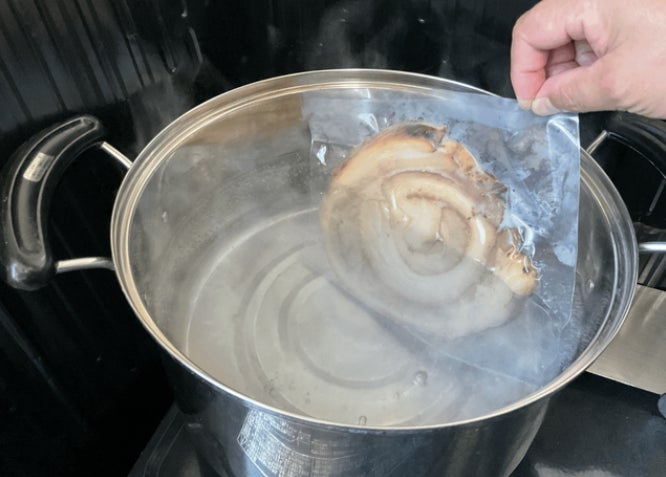 沸騰したお湯に凍っているまま2分湯煎するだけ。