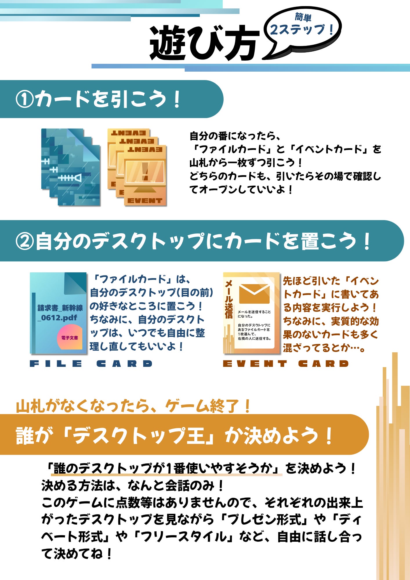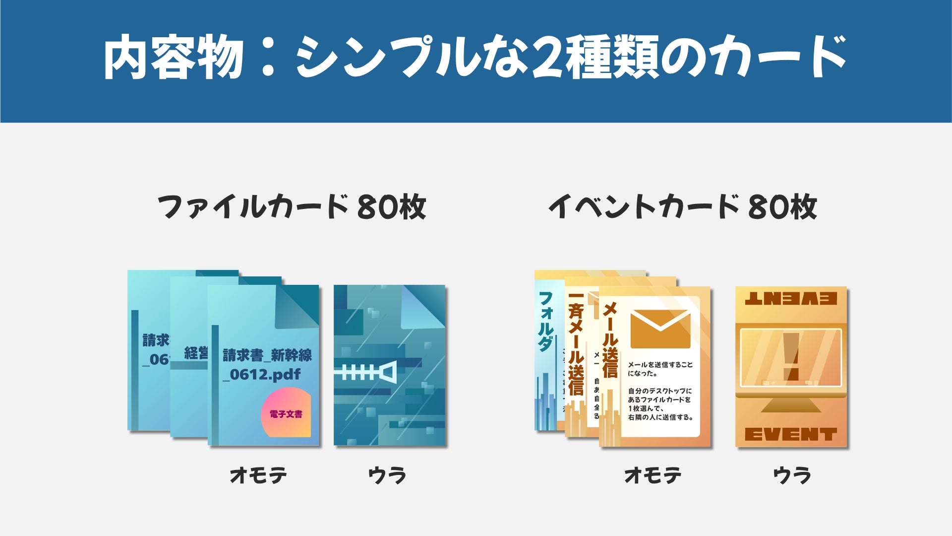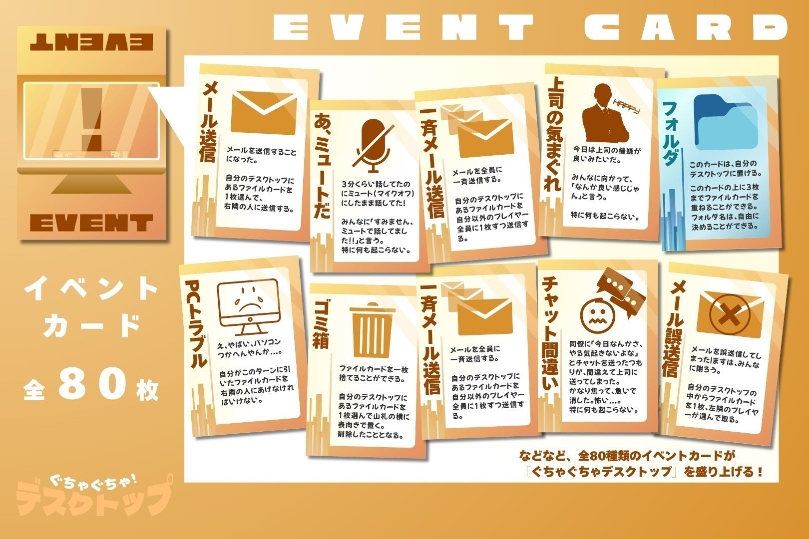 さらにさらに「イベントカード」では、メール送信や一斉送信、誤送信などで、いらない「ファイルカード」を誰かに押し付けたり、誰かから渡されたり、他にも“仕事あるある”な様々な出来事が起こります。盛り上がること間違いなしです。