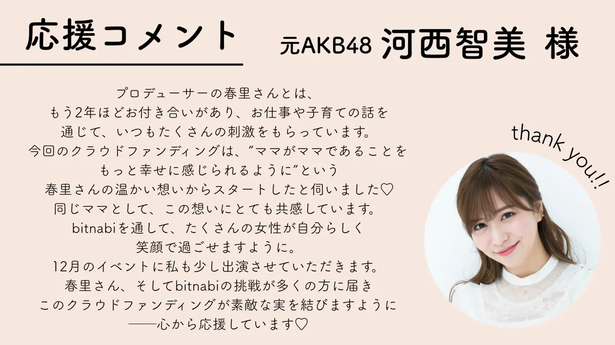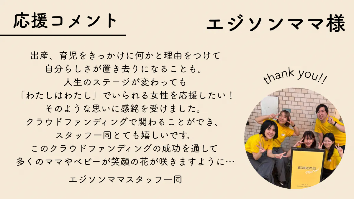 このプロジェクトは、一人ひとりのママが自分らしさを諦めずに輝ける社会へとつながる、小さな種まきだと信じています。