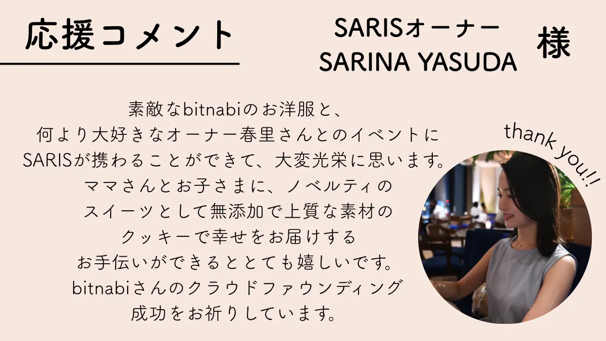 2025/11/30 08:48クラファン終了まで、ついに24時間を切りました!bitnabi × POPPO の初イベントへ“特別なかたち”でご参加いただけるのは いよいよ今だけ です。親子撮影つきチケット(アイテム付きもあり)お得なリターンはすべてクラファン内で販売中残りわずか…迷われている方は、このタイミングでぜひ!そして──クラファン終了後は、撮影チケットなしの〈お買い物専用デポジットチケット〉をbitnabi公式サイトで販売予定 です。「まずはイベントの空気を楽しみたい」「お買い物だけしたい」そんな方にも気軽に来ていただけるようにご用意します。bitnabi 初の体験イベント。あなたとお子さまの“今年いちばんの思い出”を一緒に作れたら嬉しいです。POPPOHAE新作も沢山お披露目予定です!!お客様からいただいたご質問をシェアさせていただきます⸻▶︎Q1. サンタさんには会えますか?土曜日は各回でサンタがふらっと登場する予定です。スタッフがサンタに変身している形なので、「会えるかも…?」くらいの気持ちで楽しみにしていただけたら嬉しいです⸻▶︎ Q2. 家族の付き添いに追加チケットは必要ですか?必要ありません◎今回のチケットは“親子で楽しむ”ことを前提にしているため、お子さまのお手伝いをされるご家族の方は、同じチケットでお入りいただけます。⸻▶︎ Q3. 指定時間は滞在時間ですか?入場時間ですか?「入場可能時間」となります終了ぴったりで退場する必要はございません。次の回の入場状況に合わせて、スタッフがご案内いたします。⸻▶︎ Q4. 小さなお子さま連れでも大丈夫ですか?もちろん大歓迎です!2歳・3歳・赤ちゃん連れの方も多いイベントですので、スタッフみんなでサポートいたします。どうか無理なくお楽しみください。授乳室もございます!会場は北参道から徒歩圏内住所はチケットお求めの方のみ、メールでご連絡させていただきます! もっと見る残り1日!