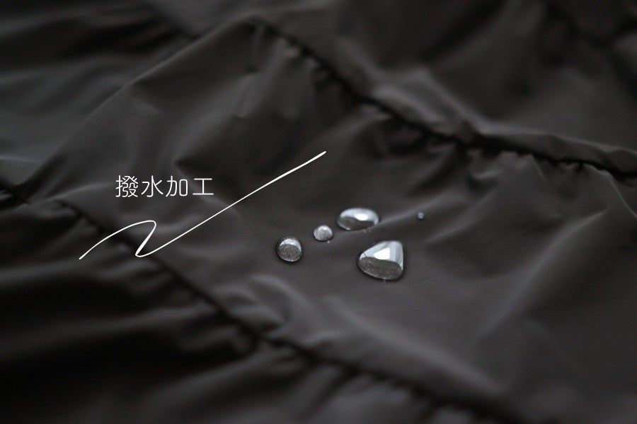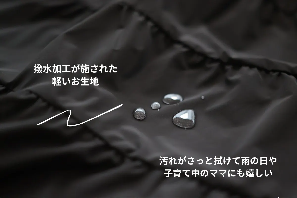 撥水加工が施された生地で、小さなお子さまがいるママでも雨の日のお出かけや汚れを気にせずおしゃれを楽しめます。
