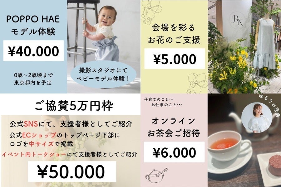 また、イベントに参加できない方でもベビーモデル体験をできたり、オーナーとのお茶会ができたり。とママを楽しめるリターンも満載です。