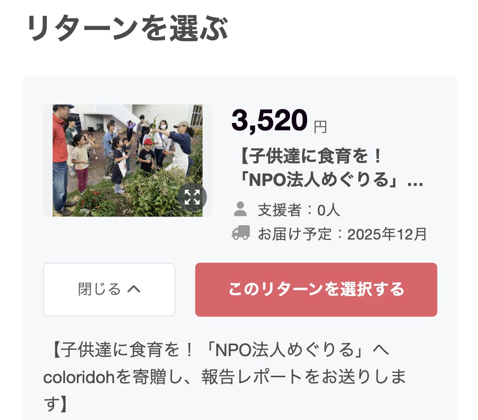 めぐりる さんは、子供達へ食育を広げるための様々な活動をされていて、coloridohもその活動に共感し、ぜひ皆様にもご支援いただけたら嬉しいな。と、リターンを開設する運びとなりました。