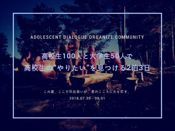 2018/07/28 19:08高校生の時から、生きる意味を見つけること。 A doc CAMP実行委員の竹田です。ついにクラウドファンディングも折り返し、残り11日。キャンプの開催も目前となり、良い場にすると共に、「その後」の彼らの支援まで、しっかりと作っていけるように準備をしています。早く参加してくれる高校生に会いたい心でいっぱいです!さて、今回も、現在、A.doc Campに賛同していただいている方々の想いをシリーズで紹介させていただきます。熱い想いを持った様々な団体・個人が一丸となって、今回の挑戦をしております。ぜひ、共感いただけましたら、ご支援・ご協力のほど、引き続きよろしくお願いいたします! 第4弾は【アイセック・ジャパンの桶田さん!】 ↓↓以下桶田さんからのメッセージです↓↓ 高校時代。多くの時間を野球に費やし、引退した3年の夏。何も熱中するものがなく、なにをやってもつまらなく、毎日が退屈でした。自分はこのままでいいのか。大人になったらどんな人間になっているのか。様々な不安を抱えながらも、いたずらに時間は過ぎていきました。 「何もしない人生なんて、緩やかな死と同じだ」という言葉がありますが、まさにその通りだと実感しました。 生きる意味を見つけることが、やりたいことを見つけることにほぼ同義だと僕は思います。 僕は、大学生になってからようやく自分が生きる意味を見つけられましたが、もっと早く見つけられていたらどんなに変われていたかということをよく考えます。高校生の時から、生きる意味を見つけること。それはとても難しいことですが、このA.doc Campでは可能だと僕は思います。 今僕にできることは、生きる意味を失った若者を撲滅すること。日本の若者全員が自分のやりたいことに熱中する社会を作れたらどんな世界が待っているか想像してみてください。一緒にそんな素敵な社会を創りましょう。 『全国の高校生が「やりたいこと」を見つけるためのサマーキャンプとその後を作りたい!』■Facebook:https://www.facebook.com/a.doccamp/■HP:http://www.a-doc-camp.com■クラウドファンディング:https://camp-fire.jp/projects/view/87363<開始3日で26万円 達成中!> 一人でも多くの力を、高校生たちの力に変えるために。皆様のご支援・ご参画、よろしくお願いいたします。(A.doc Camp 実行委員会一同) もっと見る【42万円達成!残り13日で75%!】 【特集 賛同メンバーの想い③】