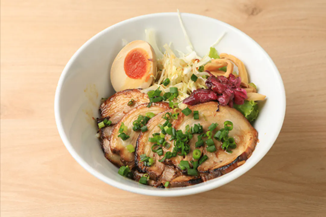 自家製チャーシュー丼:900円当店自慢の自家製チャーシューが4枚乗った贅沢丼!チャーシュー丼特別ダレがかかってご飯に染みてます。さらに自家製味付け玉子(半分)とサラダも乗っていてバランスも取れて食べやすくなっています。