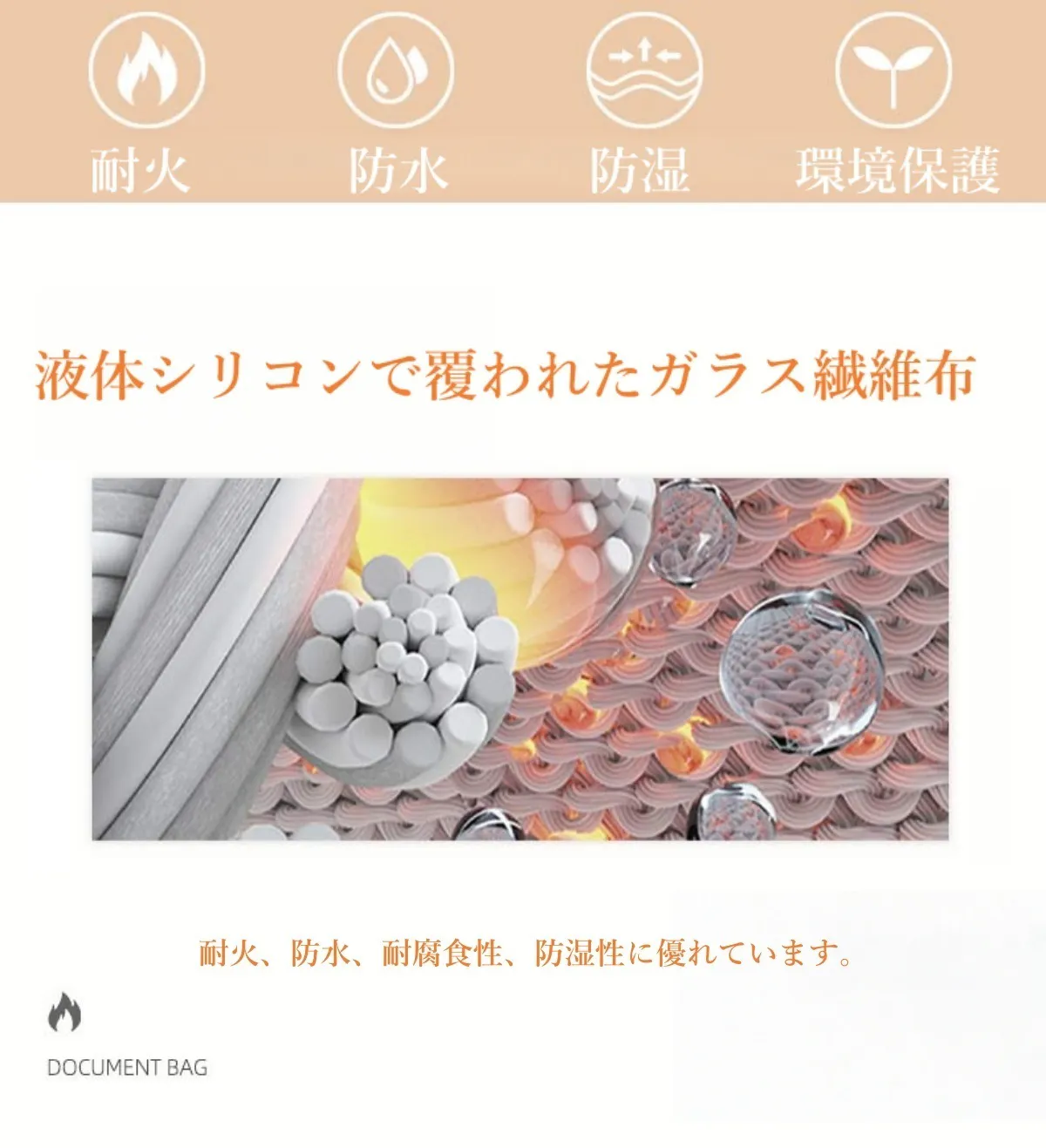 - ☑表面はグラスファイバー素材とシリコンコーティングの二重構造で火に強く、大切な物を炎から守ります。