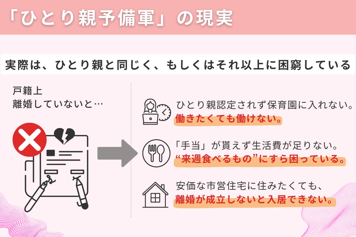 私がこの活動を始めたきっかけは、子どもが1歳半の頃、当時の夫が離婚しないまま突然家出をしてしまい、”ひとり親”としては認められない”実質ひとり親”となったことで、公的な支援の隙間を経験した私自身の実体験に基づきます。