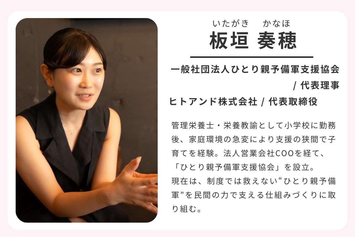 はじめまして。「一般社団法人ひとり親予備軍支援協会」代表の板垣奏穂(いたがき かなほ)です。