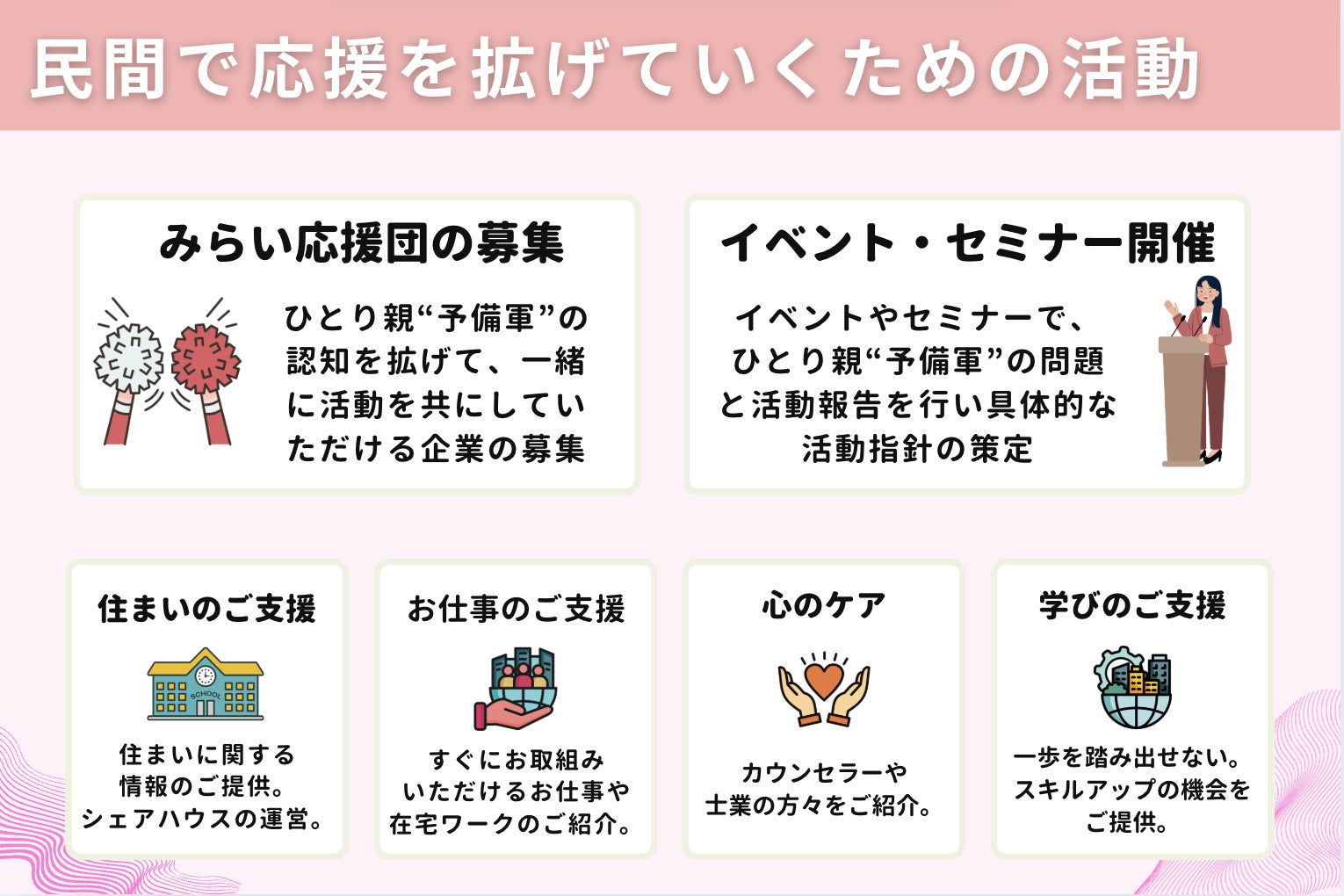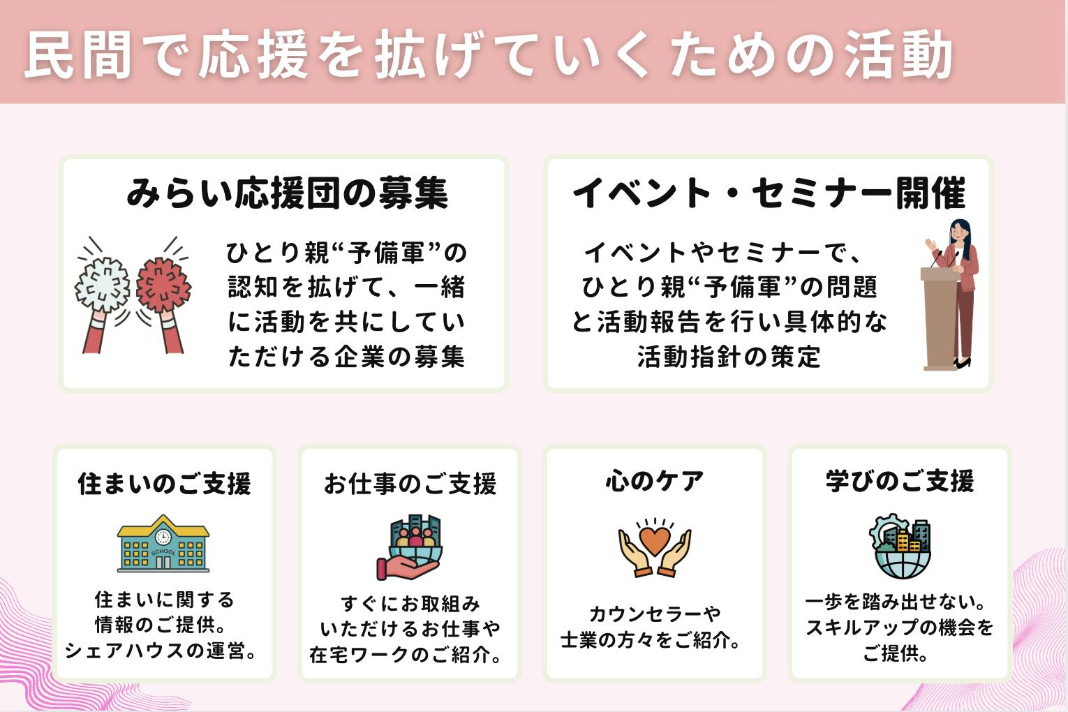 ひとり親予備軍の方々を支える事は、日本のみらいを支える子ども達を間接的に支える事に繋がると信じています。