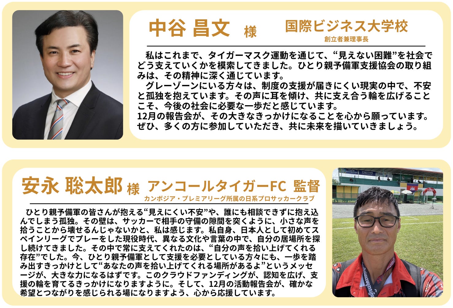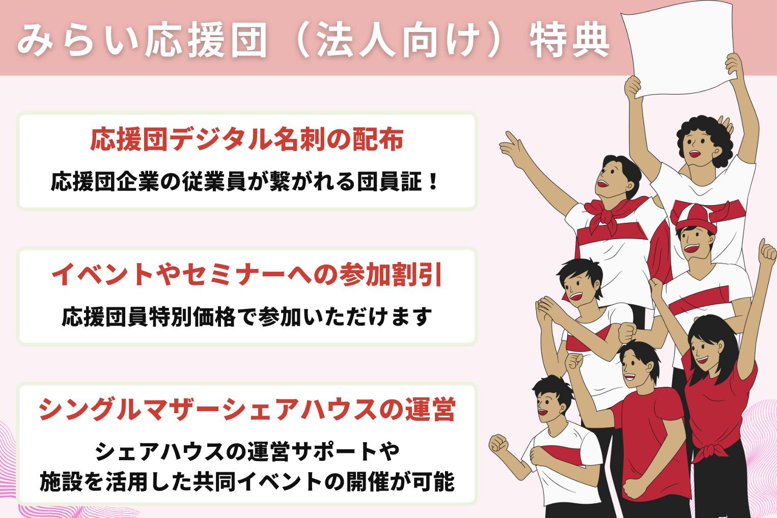 そして、法人様、代表者様には是非、『にほんのみらい応援団』の一員となって、国や行政の支援が行き届いていない、ひとり親予備軍のサポートをしていきましょう!
