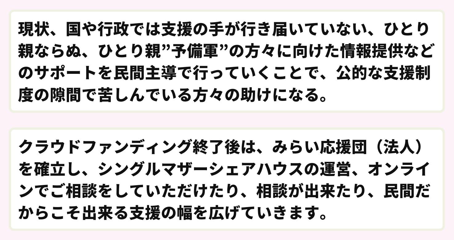 一般社団法人ひとり親予備軍支援協会と今回のプロジェクトを立ち上げた経緯を、このクラウドファンディングを通じて、お伝えできればと思っております。
