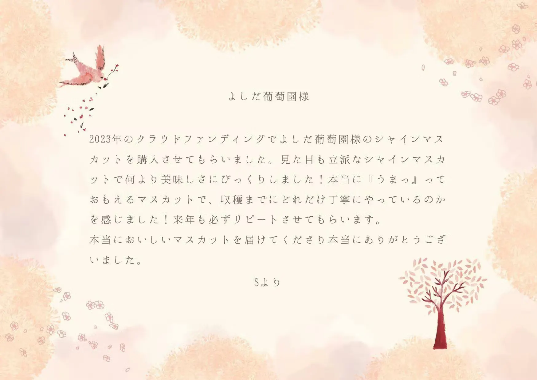 私たちのぶどうを毎年楽しみにしてくれているファンの方からこんなコメントをもらいました。
