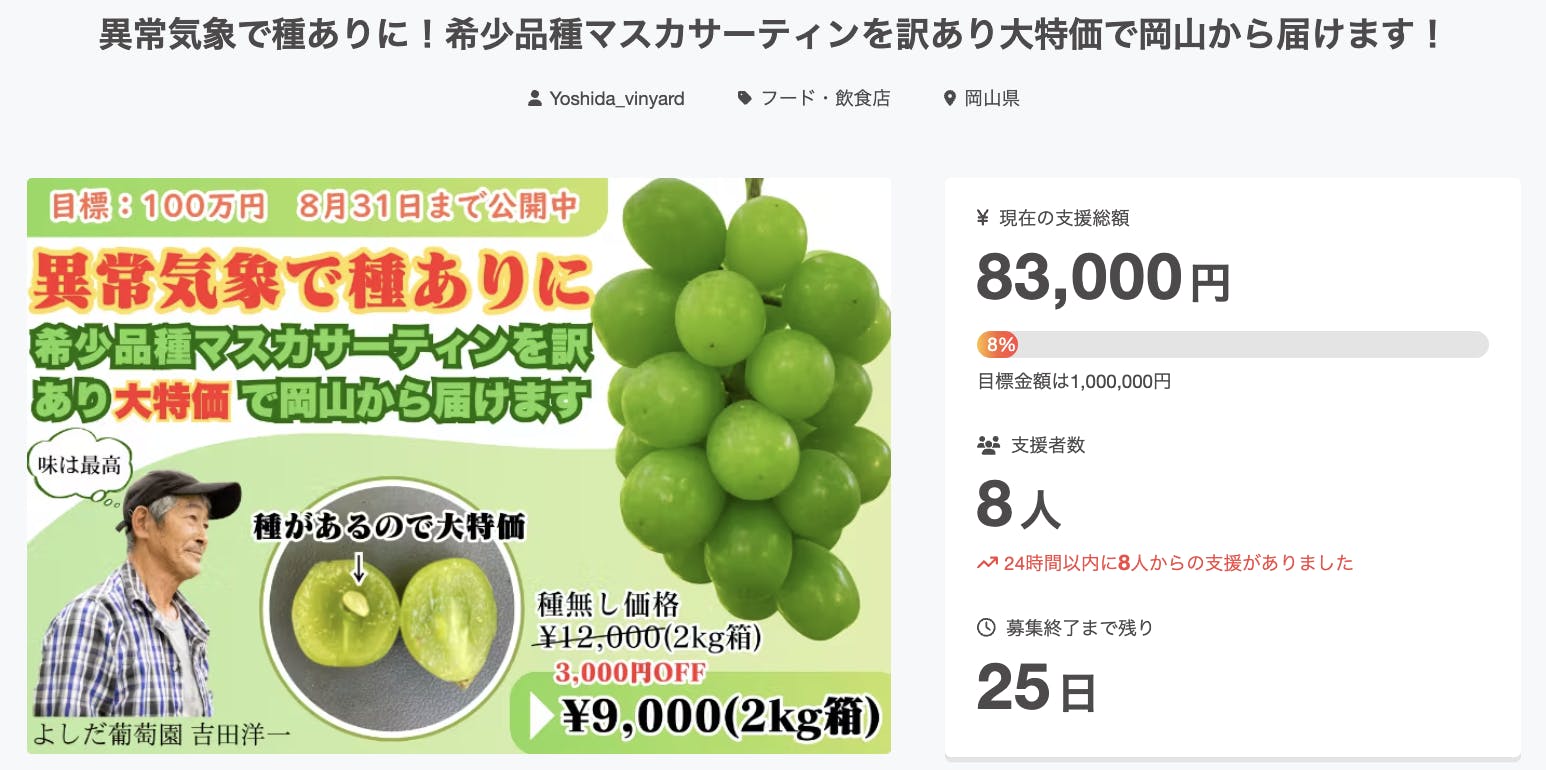 2025/08/06 08:09昨日から始まった2025年最後のクラウドファンディング!『異常気象で種ありに!希少品種マスカサーティンを訳あり大特価で岡山から届けます!』初日に8人の方からご支援を頂きました!マスカサーティンは本当に美味しいです!希少品種ですので、食べたことがない方が多いかもしれませんが今回は訳あり大特価です!気になった方は是非! もっと見る