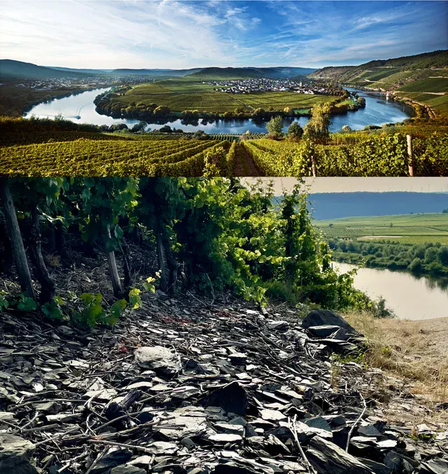 ドイツでも指折りの銘醸ワイン産地であるモーゼル川中流域では、川沿いのスレート土壌の急斜面にドイツ白ワイン用高級ぶどう品種:リースリング種が植えられています。