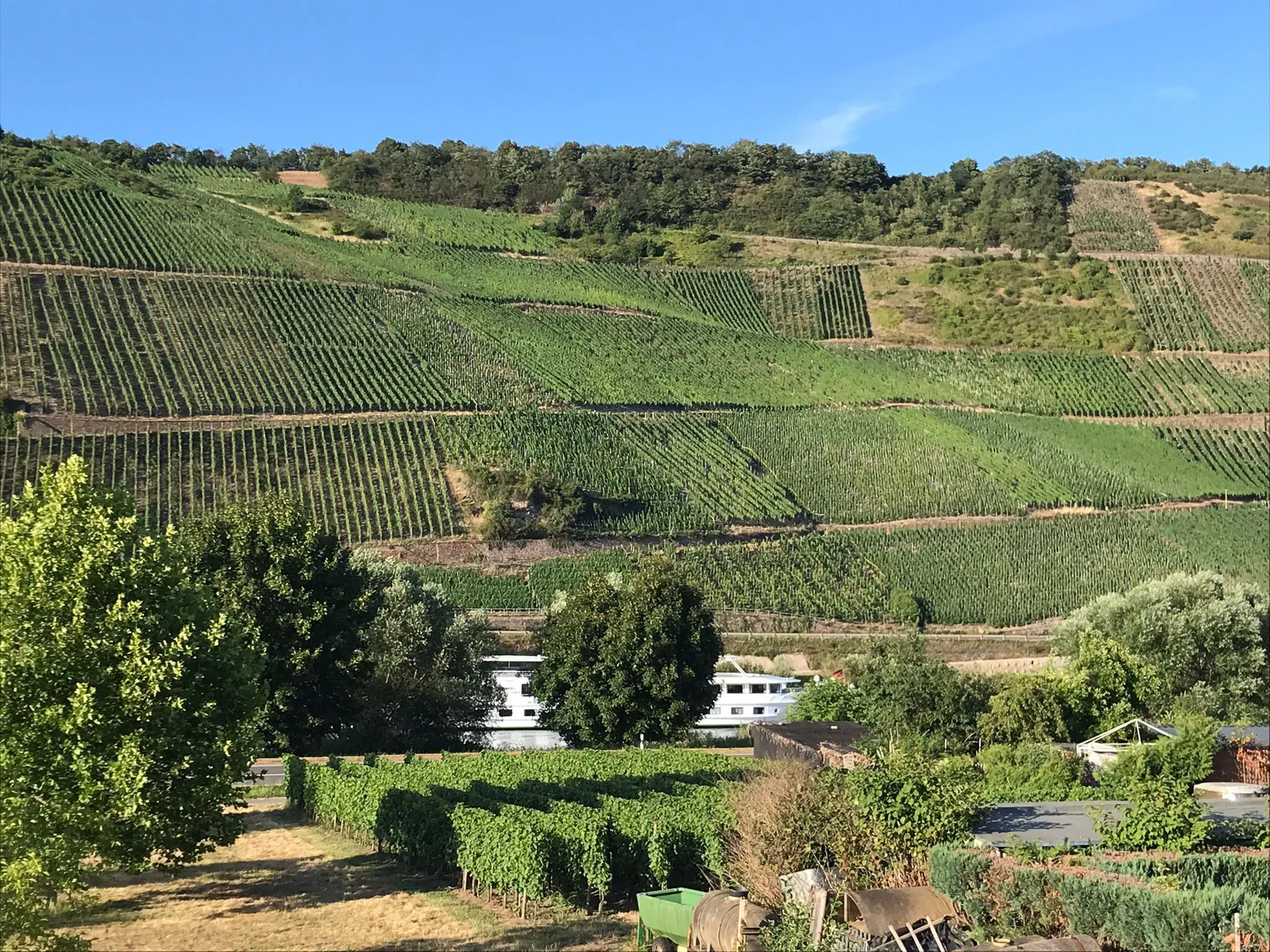 【ワイナリーとブルダーシャフトの畑の間を流れるモーゼル川には観光船も通ります】