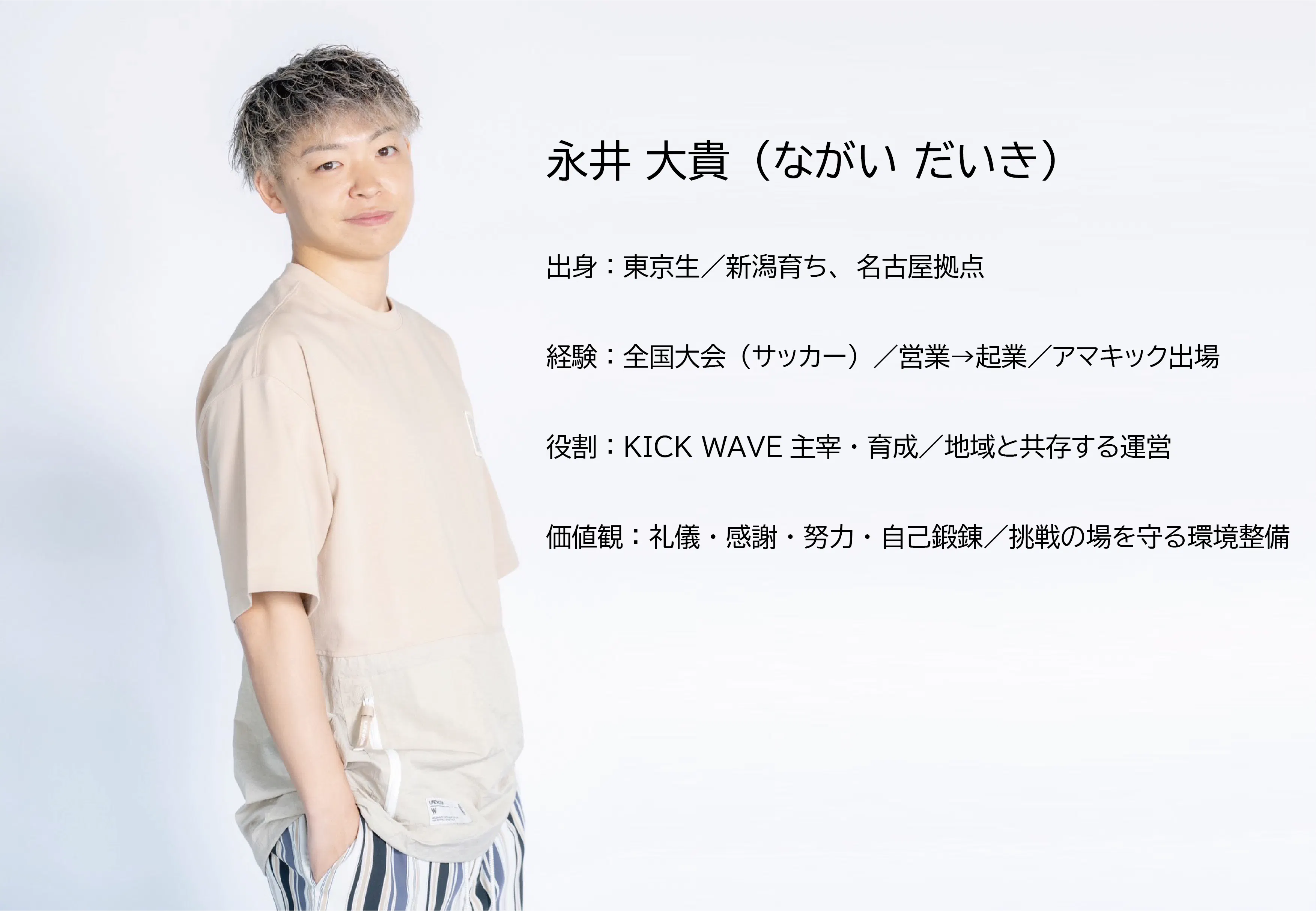 私は東京都池袋で生まれ、新潟県三条市で育ちました。学生時代はサッカーで全国大会を経験し、名古屋の大学に進学。社会に出てからは営業会社で成果を出し、独立起業しました。