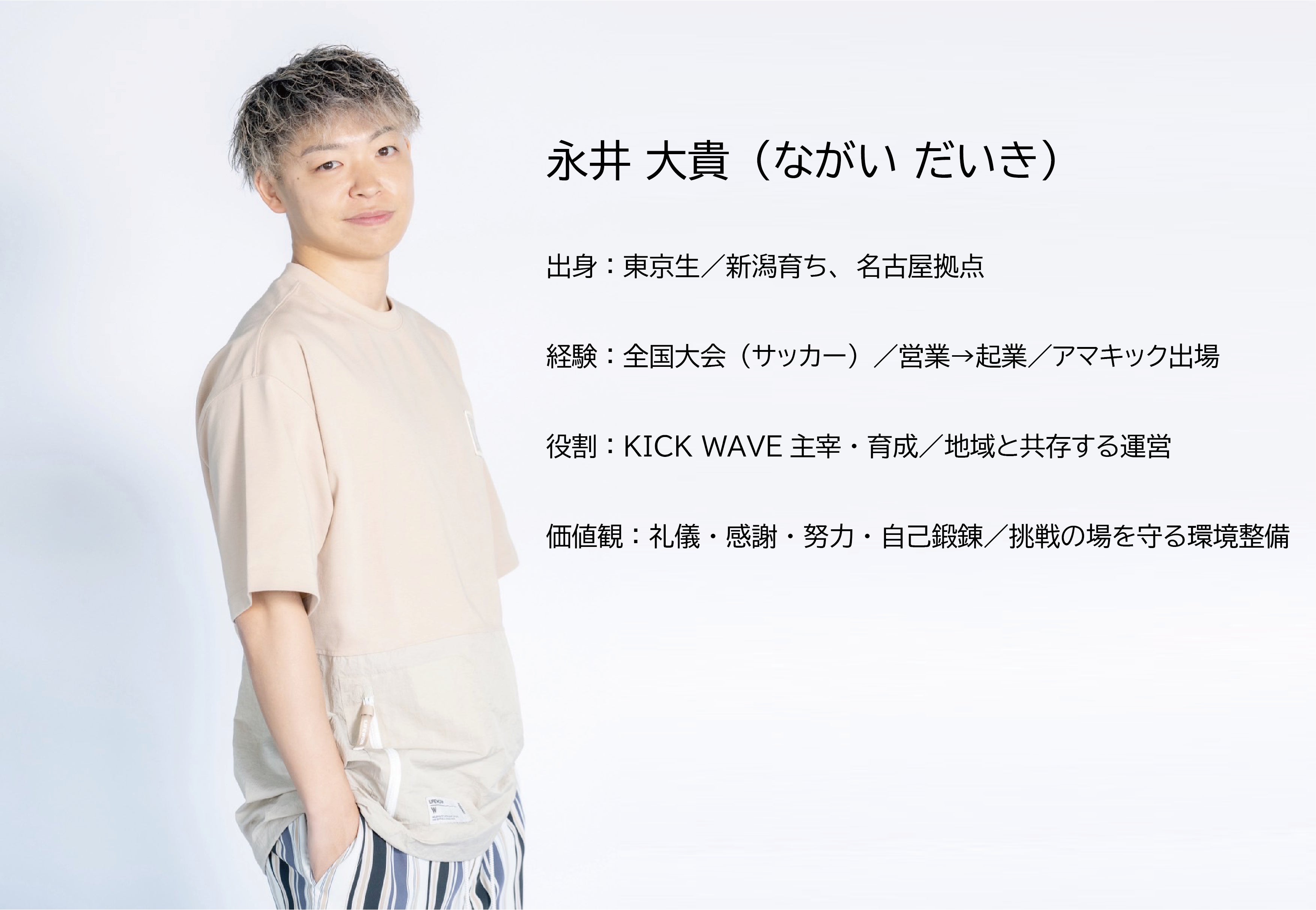 私は東京都池袋で生まれ、新潟県三条市で育ちました。学生時代はサッカーで全国大会を経験し、名古屋の大学に進学。社会に出てからは営業会社で成果を出し、独立起業しました。