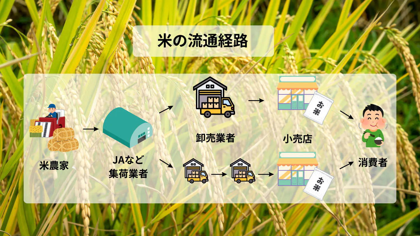 現在コメ農家が生産した米のほとんどは、農協に出荷され、その後いくつかの中間業者を経て小売業者から消費者様の手元に行き渡っております。