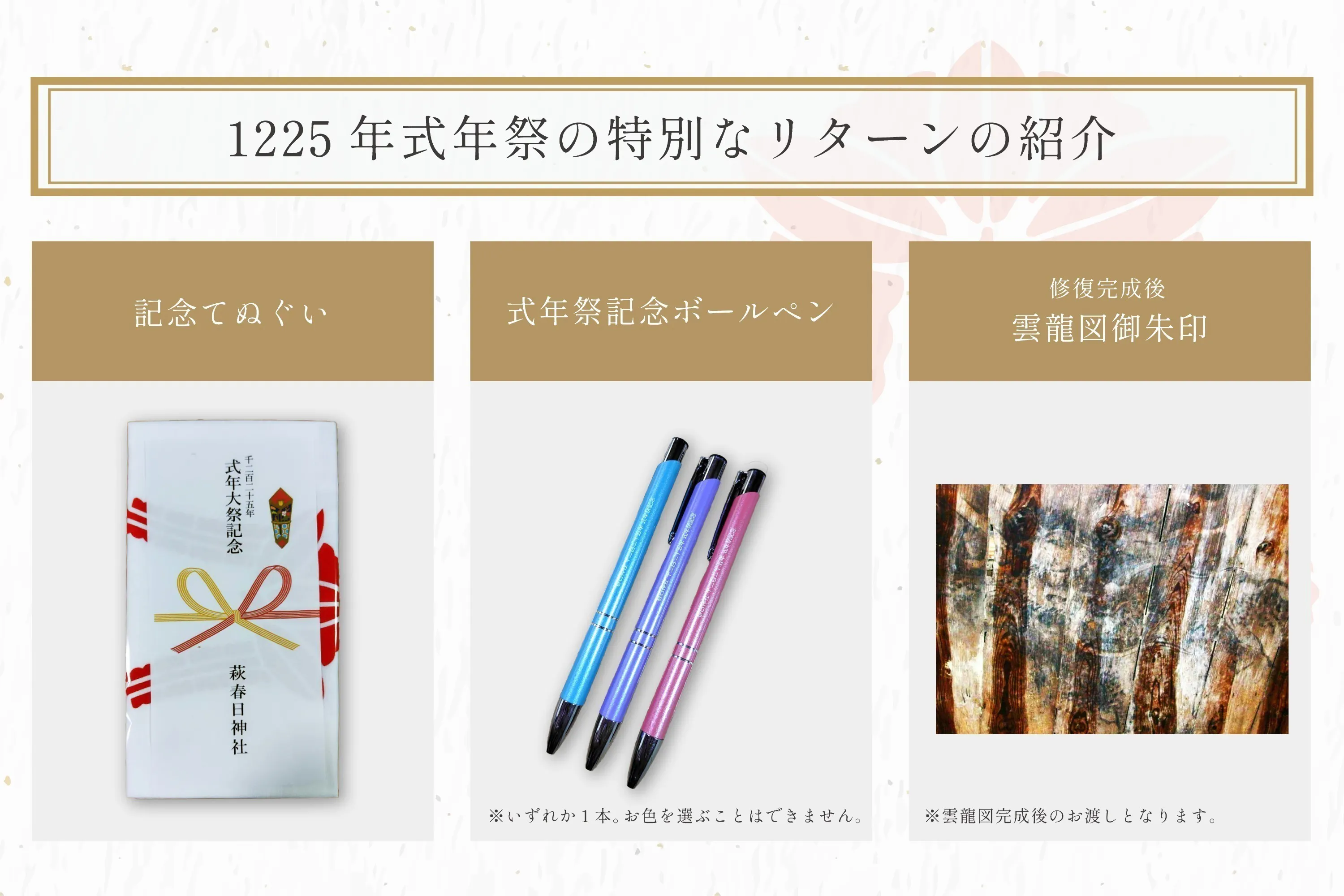 10000円 式年祭記念ボールペン、記念手ぬぐい、雲龍図御朱印(雲龍図完成後の作成になります) 神社拝殿に支援者様のお名前の掲載