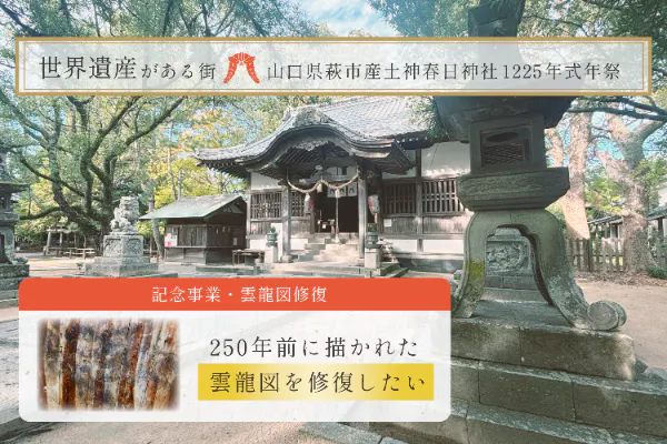 春日神社は、807年に萩市の国守某によって奈良の春日大社より萩の地に勧請され毛利輝元公により現在の萩市堀内に鎮座され防長二州の祈願所となりました。1773年の萩の大火の被害にあいましたが1774年に再建されました。約250年の経過とともに再建時に毛利公の指示により神社天井に描かれた雲龍図の劣化が進み、このままでは貴重な文化遺産が失われかねない状況でした。令和10年に迎える春日神社1225年式年大祭を記念し雲龍図を修復し、県内外の方々に再び見ていただくためにクラウドファンディングを立ち上げることにしました。