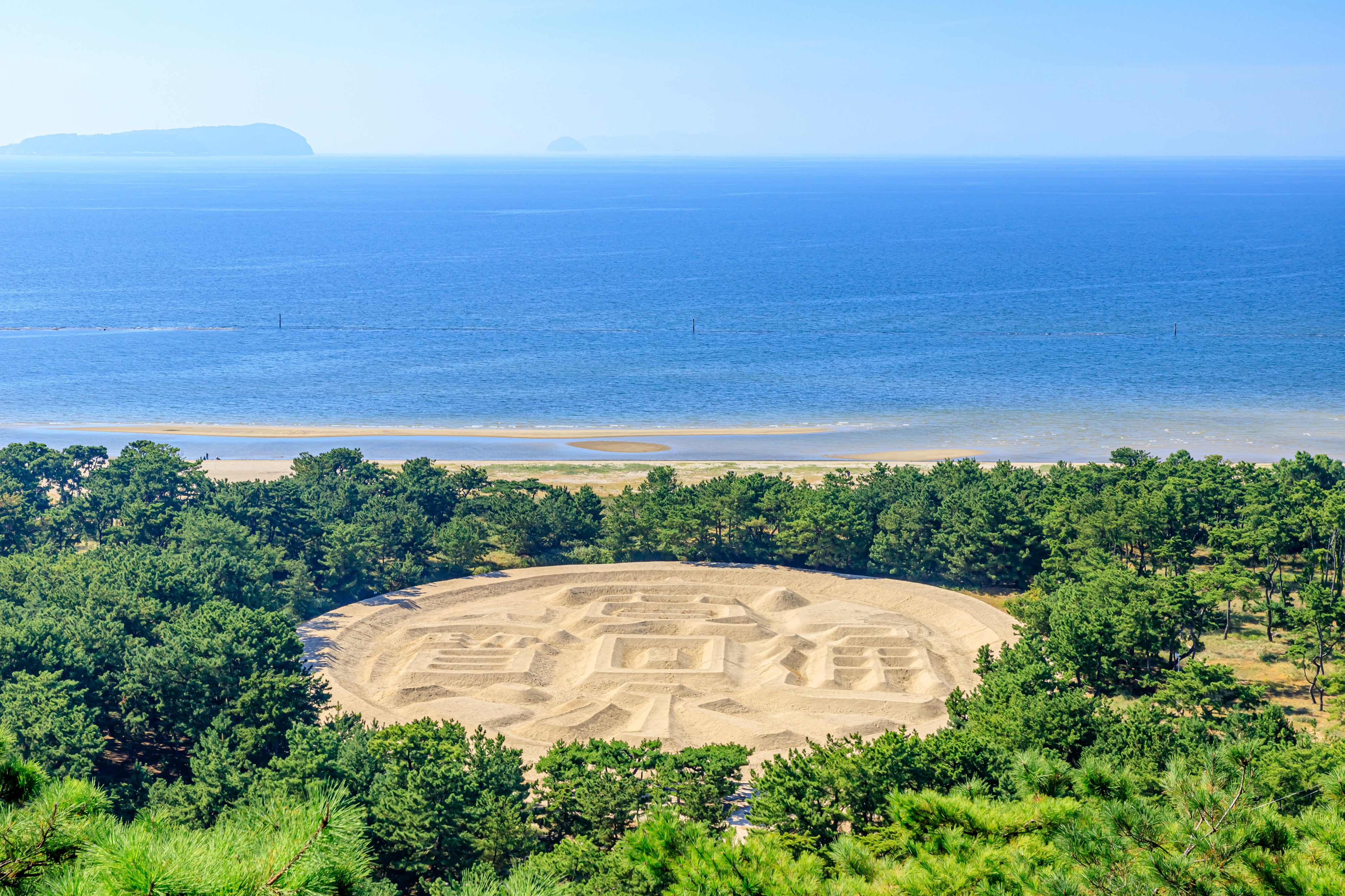 観音寺市の象徴でもある「寛永通宝」の巨大砂絵。東西122m、南北90mもの大きさで描かれた砂絵は、見る人に「健康・長寿・富」をもたらすと伝えられています。展望台から見下ろすと、砂で描かれた文字の迫力に思わず息をのみます。宿からほど近い場所にあり、旅の縁起担ぎにもぴったりです。