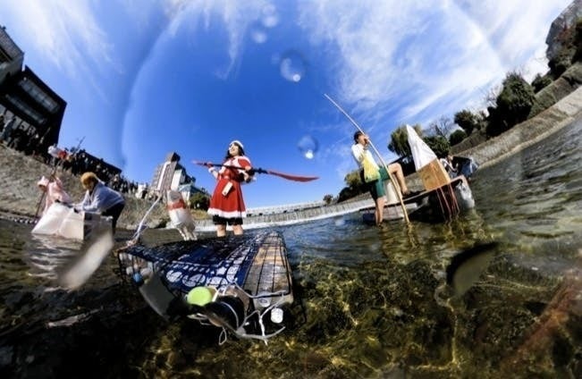 冬の鴨川を自作のイカダで下り、速さを競い合います。ただしイカダは突貫工事の欠陥品!? 壊れたら頑張って泳ぎます!