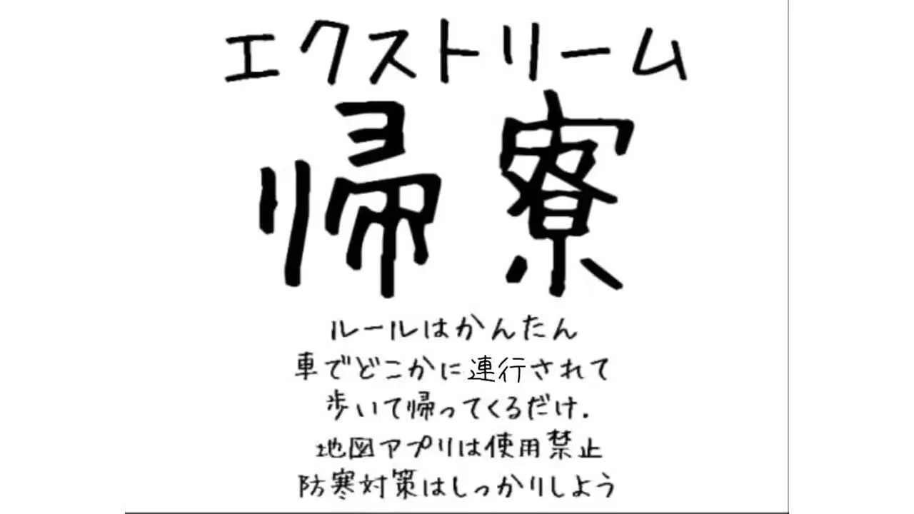 ルールは簡単。目隠しされた強者が車でどこかに運ばれたあと帰ってくるだけ。もちろん徒歩で。スマホも使用禁止です。