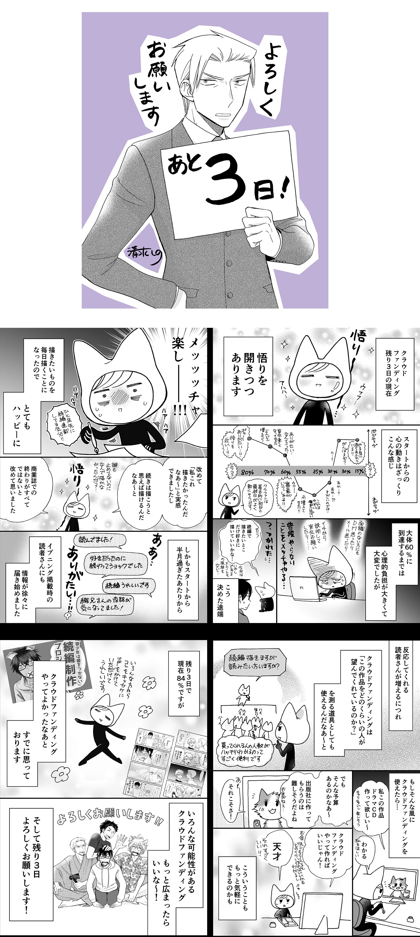 昨日は企画のフィナーレ配信ありがとうございました! 最後120%150万円で終了となりました。本当にありがとうございます。 皆様にご支援&応援いただいたおかげです! この後は、続編制作に入りまして、9月下旬から1話を配信していく運びとなります。 リターン品も随時作成&送付されていきますので、スケジュールなどは後日お知らせいたします。 ご支援者様には、1話ずつPDFデータが送られます。その後配信は漫画アプリトリガーで行い、時間差で各種SNS(pixivやnote)で全文公開される予定です。 5話分配信された後は、それを1巻として電子書籍が各種ストアにて販売されます。 1巻の売上によって2巻以降の制作が決まりますので、また1巻発売時には拡散にご協力いただけますと幸いです! またお祭りのように楽しくプロモーションできたらいいなと思っております! 1話配信まで1ヶ月ほどお待たせしてしまいますが、作画配信は来月より行いますので、私の作業状況確認してコメントなどお気軽にしていただければと思います。 今回は、目標達成だけでなく、結果120%というハイ達成が実現できて、本当にありがとうございました!!! 引き続き見守っていただければ幸いです!! 清水しの