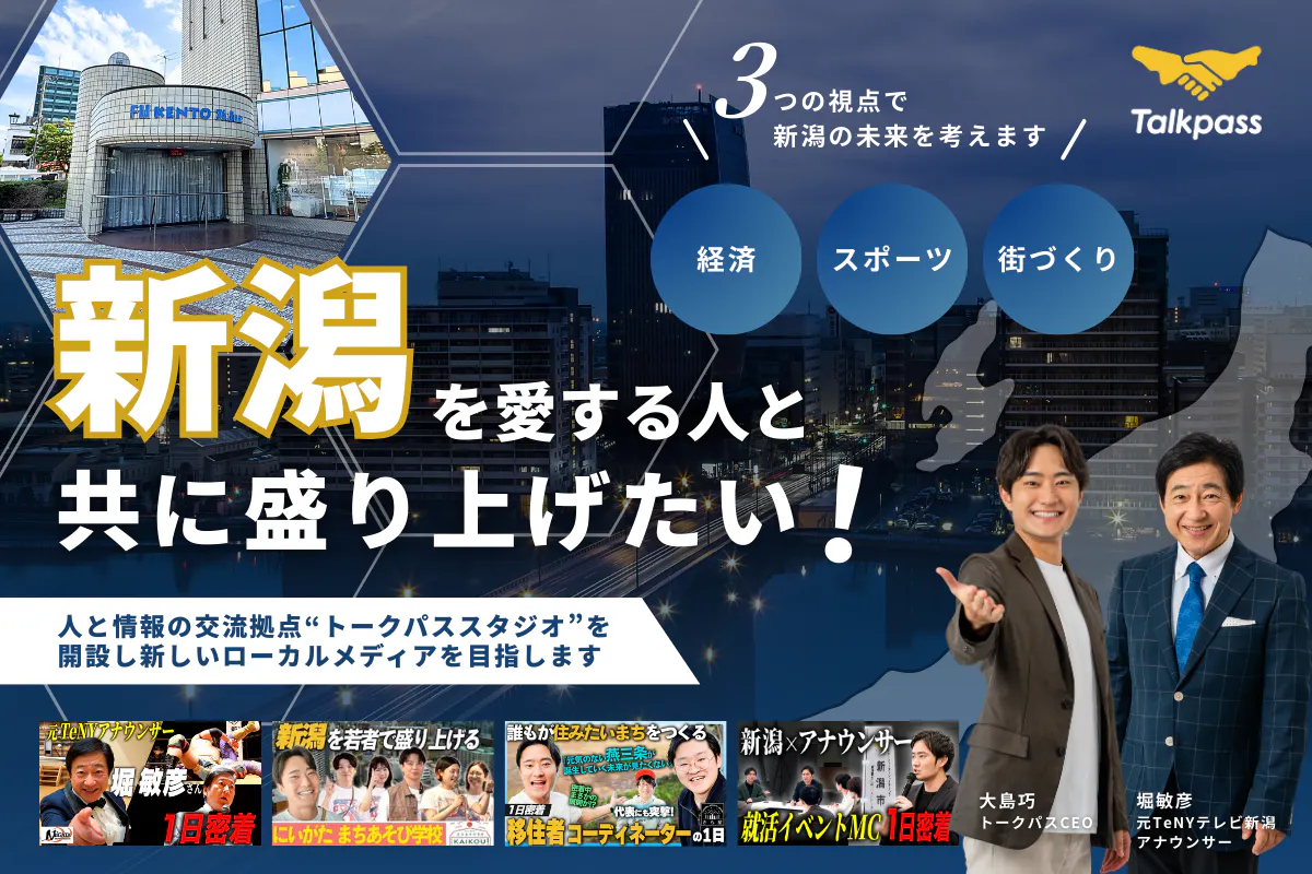 このまちで暮らす当事者だからこそ、もっと人が生き生きと暮らし、その魅力が県外にも届き、産業も街もスポーツも発展する県になると信じています。だからこそ今、私たちができることは、新潟の挑戦や魅力を可視化し、若者や県外の人に届く“発信拠点”をつくることです。