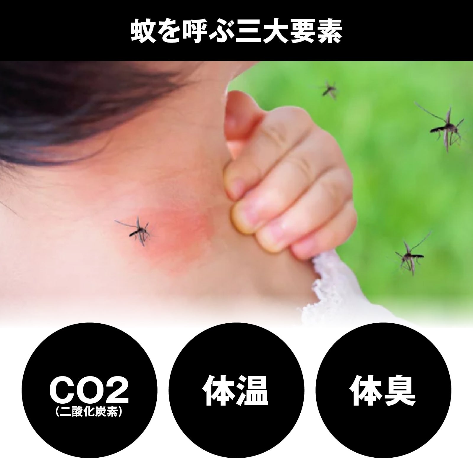 蚊は感覚器官がとても発達しており、人の体から発する二酸化炭素、体温、臭いを探知して近寄ってきます。
