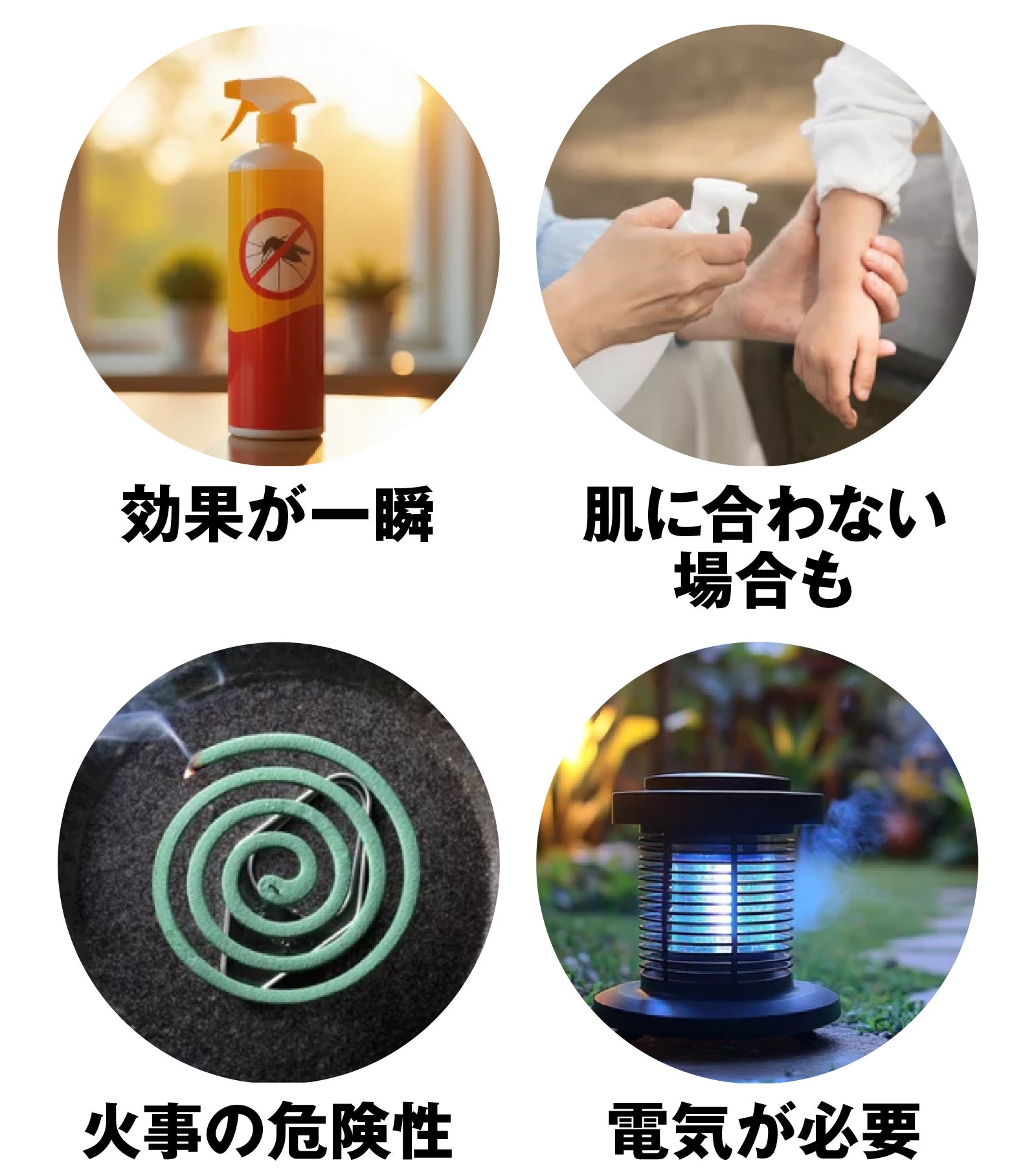 しかし、薬品である防虫スプレーは肌に合わなかったり、持続時間が短かったりと問題点も。