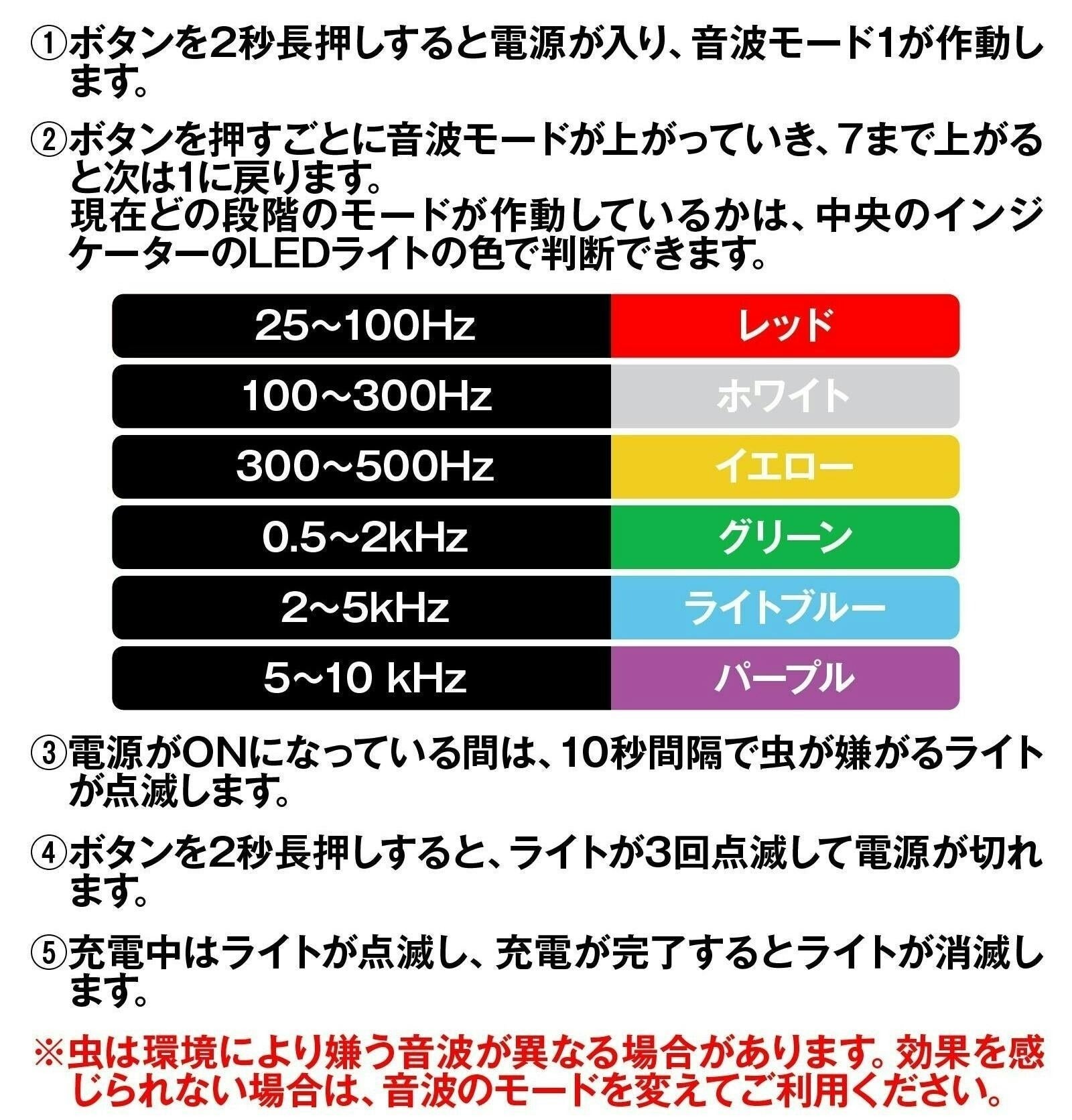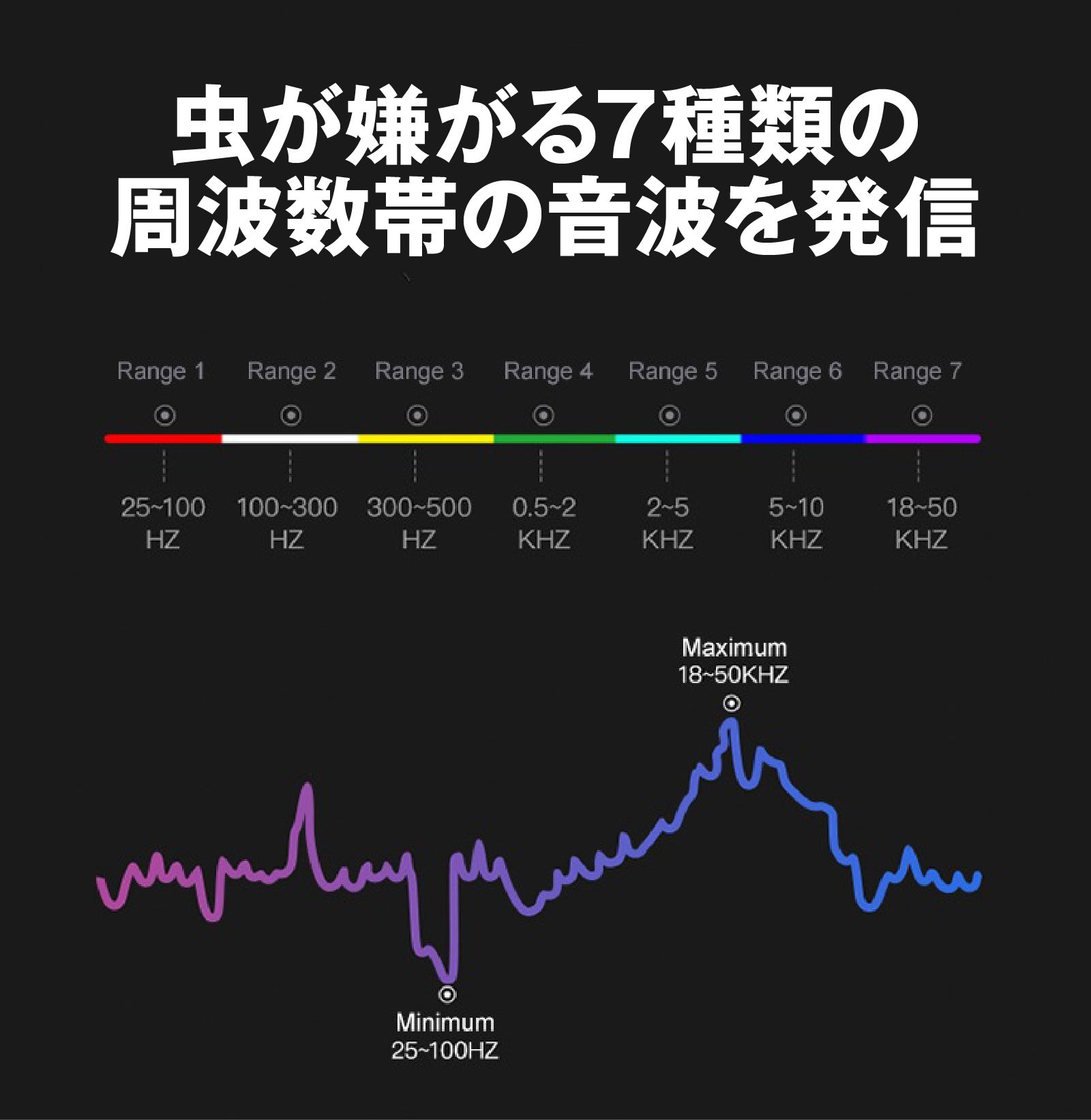 【虫封じ結界】はそれぞれの不快害虫が嫌がる7種類の周波数帯の音波を発信し、虫があなたに近づくのを回避します。