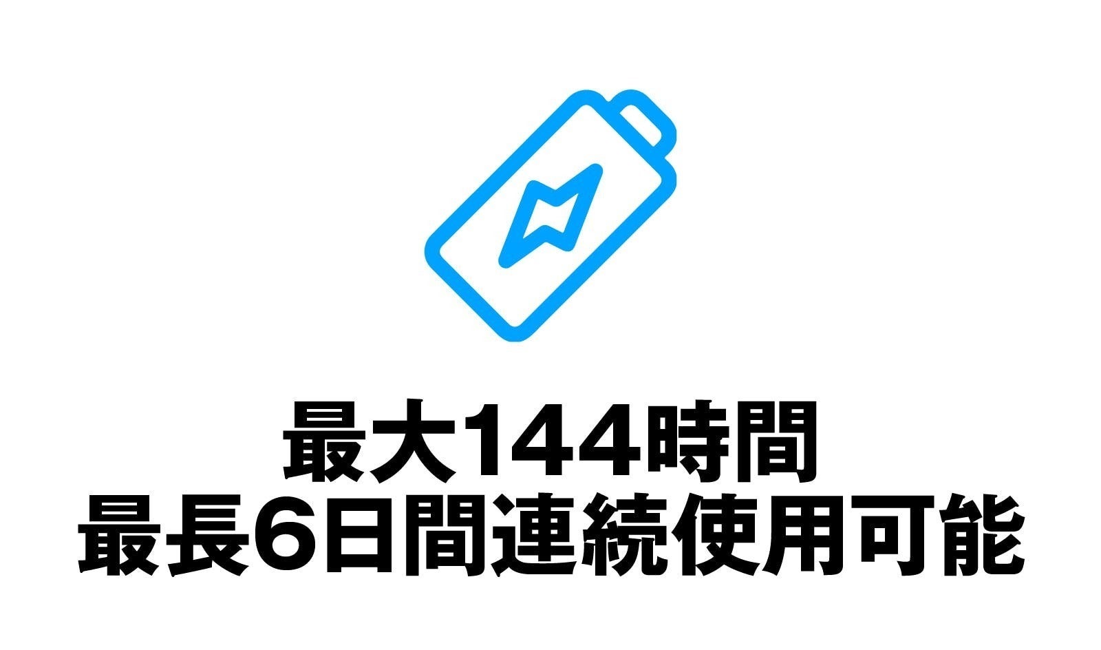 一回の充電で最大144時間、実に最長6日間も連続でご使用いただけます。