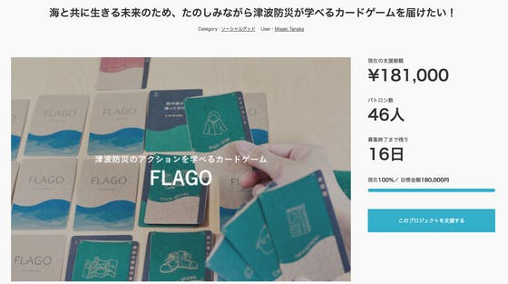 2018/07/15 21:11海の日を目前に、目標達成しました! これはこれは、びっくりしすぎてなんどもクラウドファンディングのページを再読み込みをしました...わあ、本当に皆さんありがとうございます!!! このFLAGO(ふらご)は、私たちが作りたいものに対してお金を支払ってもらうのでは意味がないと思い、制作してから支払ってもらうのではなく、今はまだ「データしかない」という状況から、本当に欲しい人にだけ届けられるようにクラウドファンディングを活用することを決めました。 (写真にあるカードは試しに印刷したものなので、少しデザインは変わると思います!) まさかこんなに早く達成するとは思ってもいなくて、7月末までをクラウドファンディング期間に設定しているのです。なので届くまではもう少しお待ちください...! 印刷会社さんも海と地球にいいものを作れるパートナーを公募しました 実は、「津波防災」のカードゲームとはいえ、防災だけやってればいいというのは嫌だなあとおもい、カードの素材そのものも海にとってもいいものにしたい、そう思い共感してくださる印刷会社を探しました。 そこで出会った印刷会社さんは、髪の素材だけでなく、カードを制作するまでの工程の中でも環境にいいかどうかを細かくチェックしてくださり、いろんなパターンを探した上で紙と印字するためのインク(トナー)を選んでいます。 一度決めた紙と印刷方法も、今一度チェックしているので、最後までどんな紙でどう印刷されるのかわからないのですが、皆さんの手元に届くFLAGOは海を心から愛する人たちの愛が詰まったものであることは間違いありません。 FLAGOを手にすること自体が地球や私たちにとっていいみらいをつくることにつながりますように。 もっと見る